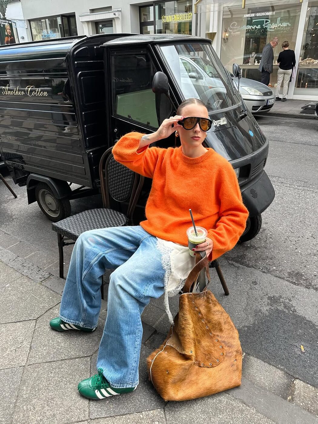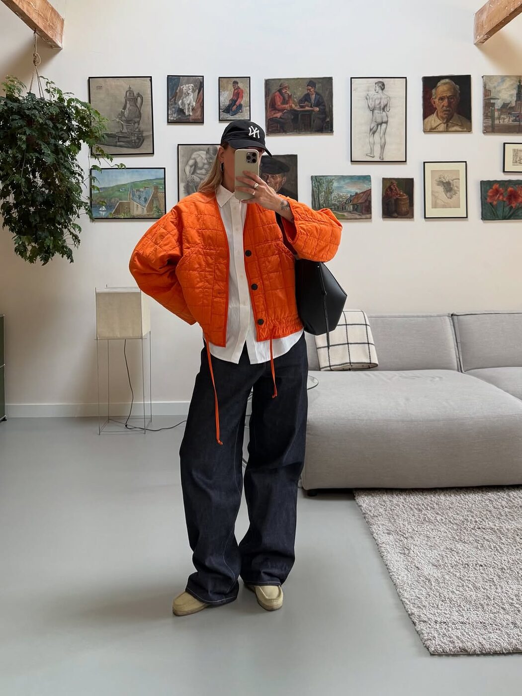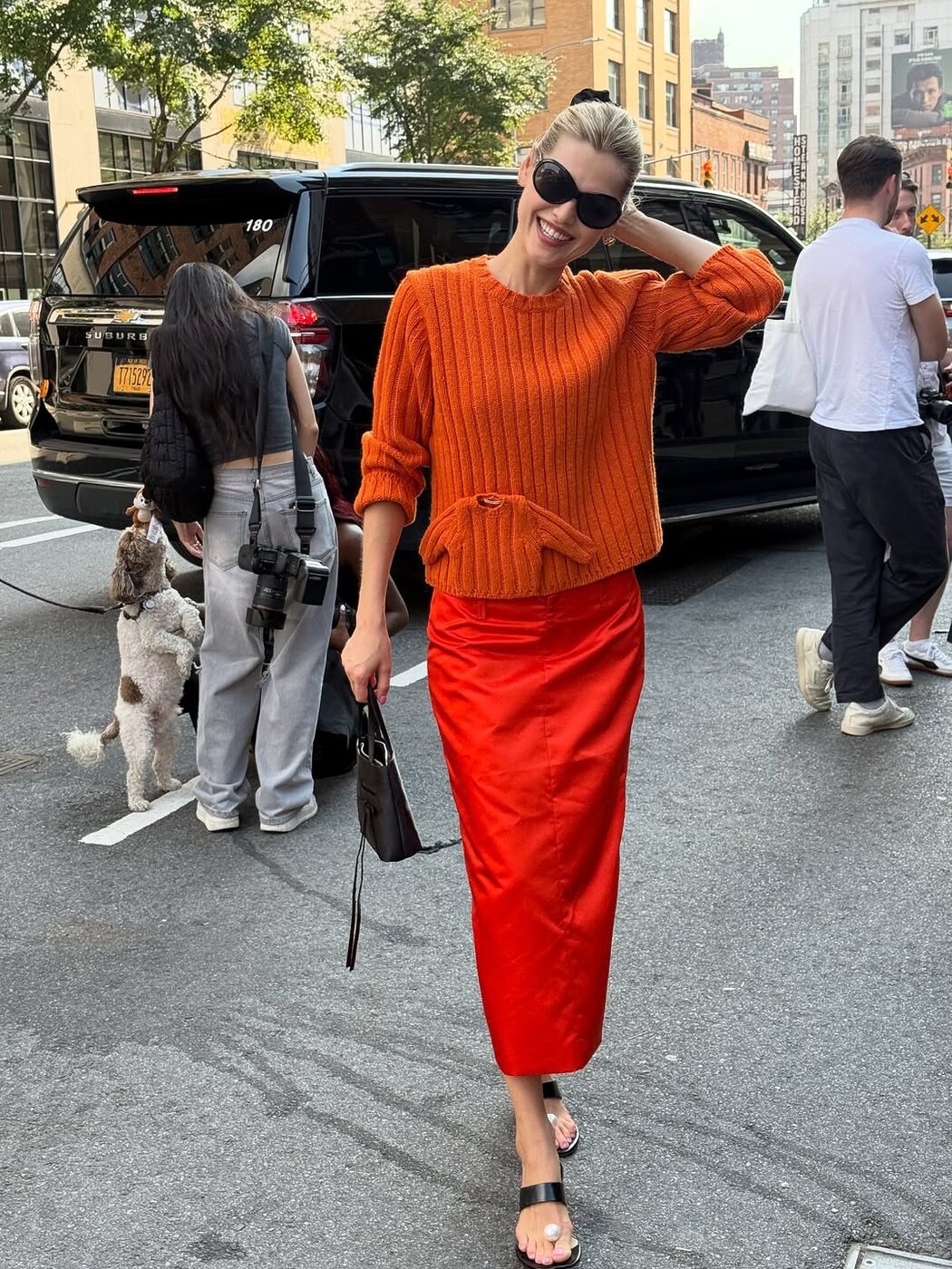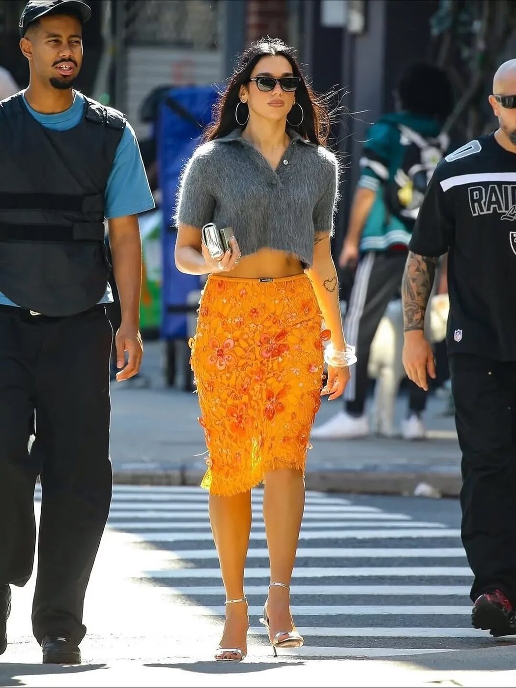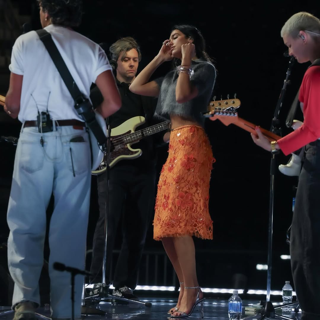또 다른 오렌지에 빠진 셀럽 두아 리파가 있습니다. 그녀는 출시 전이었던 아이폰 17 프로 맥스의 코스믹 오렌지 컬러를 미리 손에 쥐고 있었는데요. 투어가 한창인 시기에 비니와 가죽 베스트의 힙한 옷차림에 더하거나 반짝이는 실버 드레스의 글래머러스한 무드에 더하기도 하면서 흥이 잔뜩 오른 셀피를 남기며 자랑해 보였죠. 작은 핸드폰은 물론 오렌지에 진심인 모습은 그녀의 사복에서도 찾아볼 수 있었는데요. 복슬복슬한 그레이 크롭 니트에 플라워 시퀸 디테일의 오렌지 스커트를 매치했습니다. 모노톤에 강렬한 컬러 포인트를 더하면서 디테일과 실루엣으로 여성스러움을 보여주었죠.