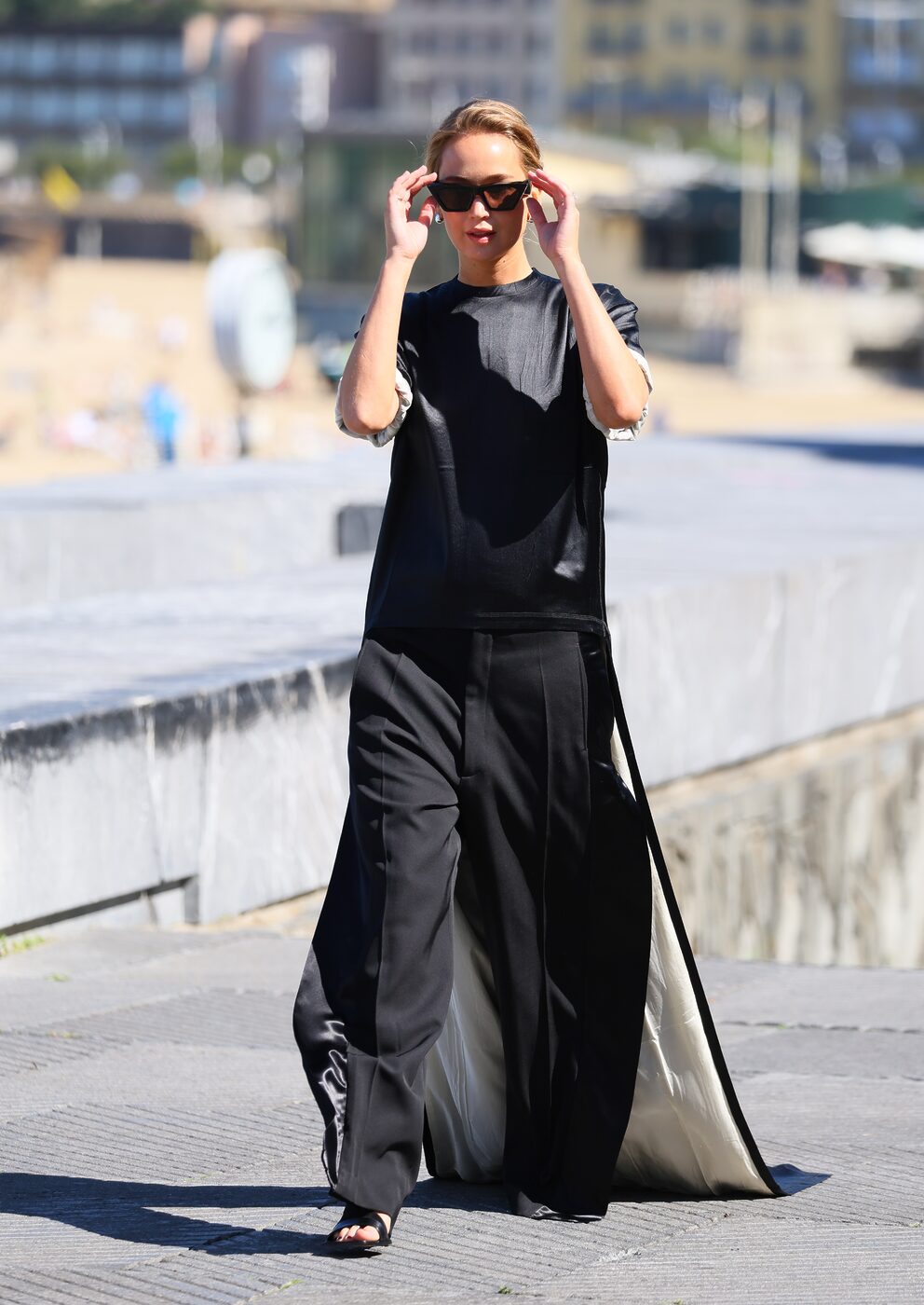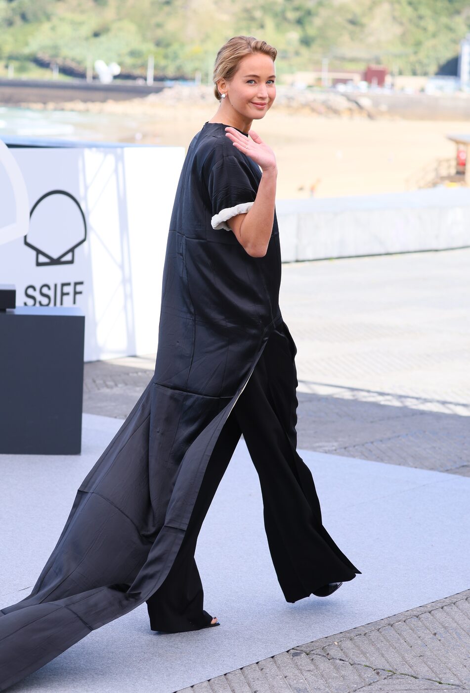 요즘 제니퍼 로페즈의 최애 브랜드는 피비 파일로인가 봅니다. 지난달 열린 제 73회 산 세바스티앙 국제 영화제에서도 피비 파일로 룩을 착용했는데요. 앞은 평범한 블랙 티셔츠같지만 뒤에는 긴 테일이 늘어져 드라마틱한 효과를 주는 피스였죠. 여기에 넉넉한 핏의 테일러드 팬츠로 시크한 룩을 완성했습니다.