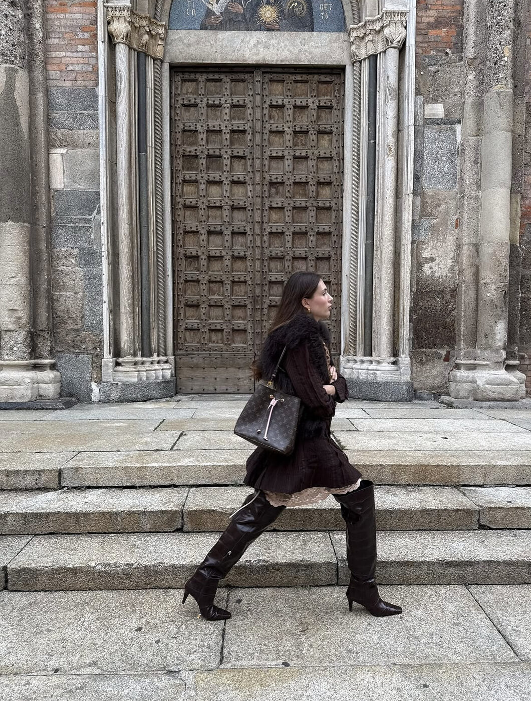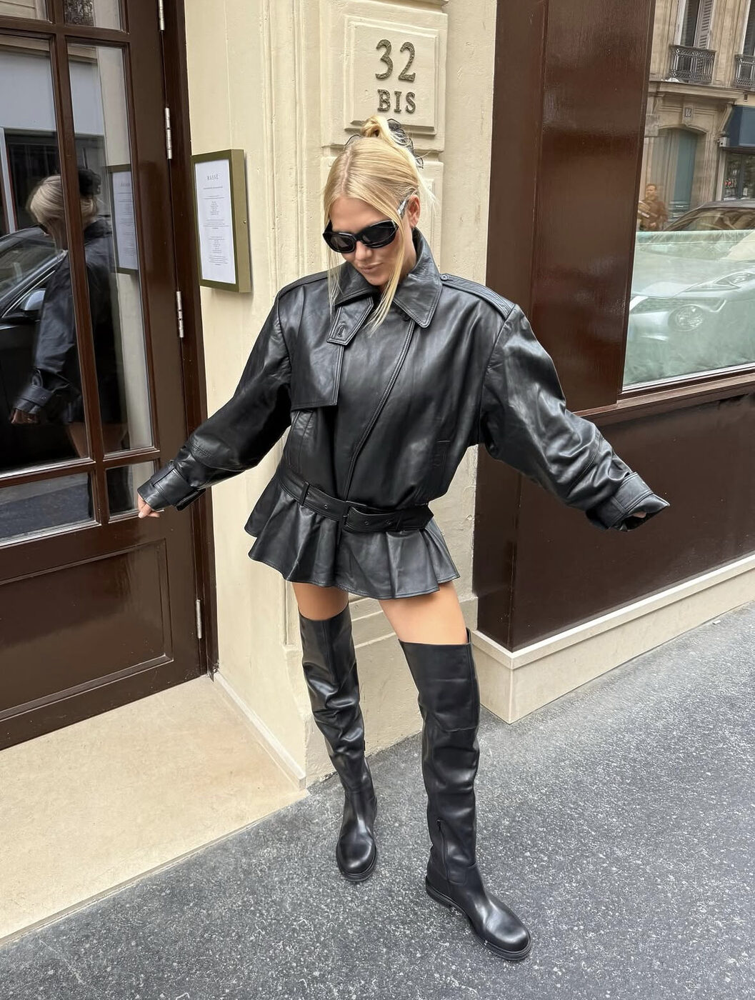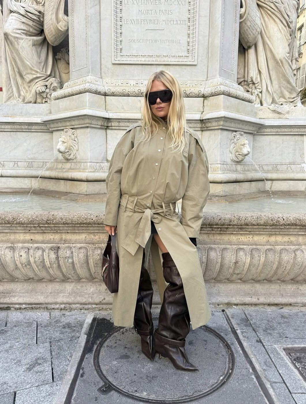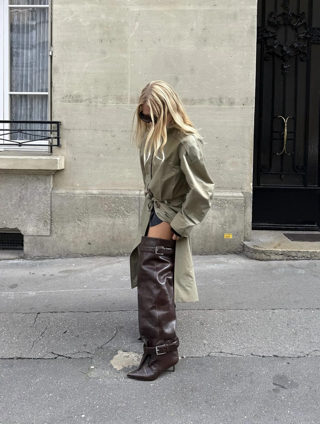 무릎은 물론, 허벅지도 가려버릴 과감한 기장의 버클 부츠에 트렌치 코트를 매치한 스타일. 코트 아래는 부츠가 자연스럽게 보이도록 흩날려주는 게 포인트! 지금 시도해야할 가장 쿨한 조합이겠군요. 부츠가 워낙 높아서 하의가 보이지 않는데, 오히려 그 점이 이 룩에서 스타일리시함을 끌어올립니다. 부츠의 컬러도 눈여겨볼 부분인데요. 차분한 다크브라운 톤이라 소재의 질감이 잘 살아나면서 전체적인 룩이 고급스러워진 것 같죠.