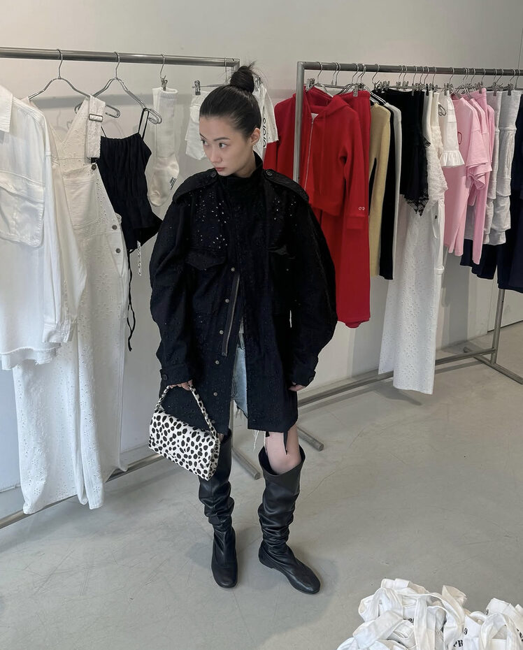 또한 소재가 유연해 무겁지도 않죠. 하의로는 미니스커트나 쇼츠에 오버핏 재킷을 더해 하의실종 룩을 완성해볼 수도 있고요. 다소 투박한 부츠라도 상의의 덩치를 키우면 전체적으로 밸런스가 잘 맞아집니다.