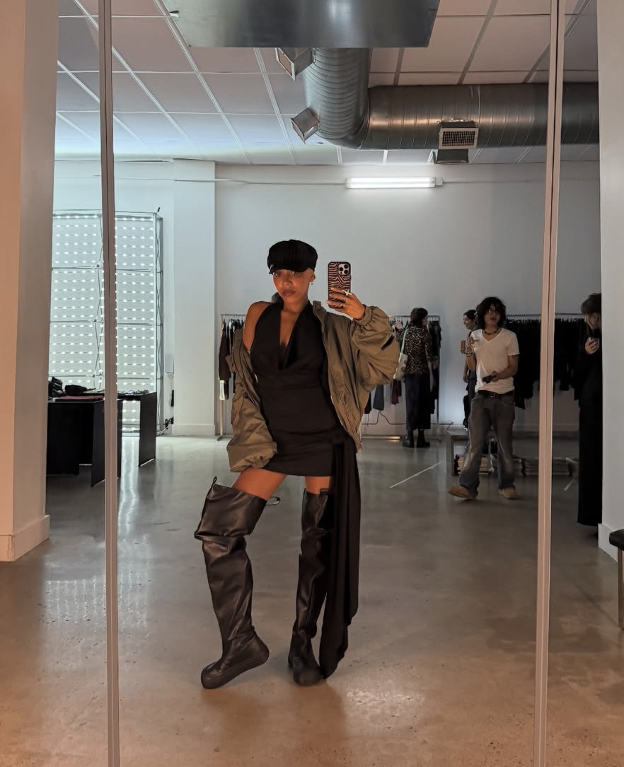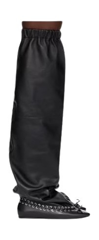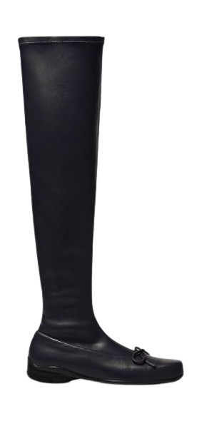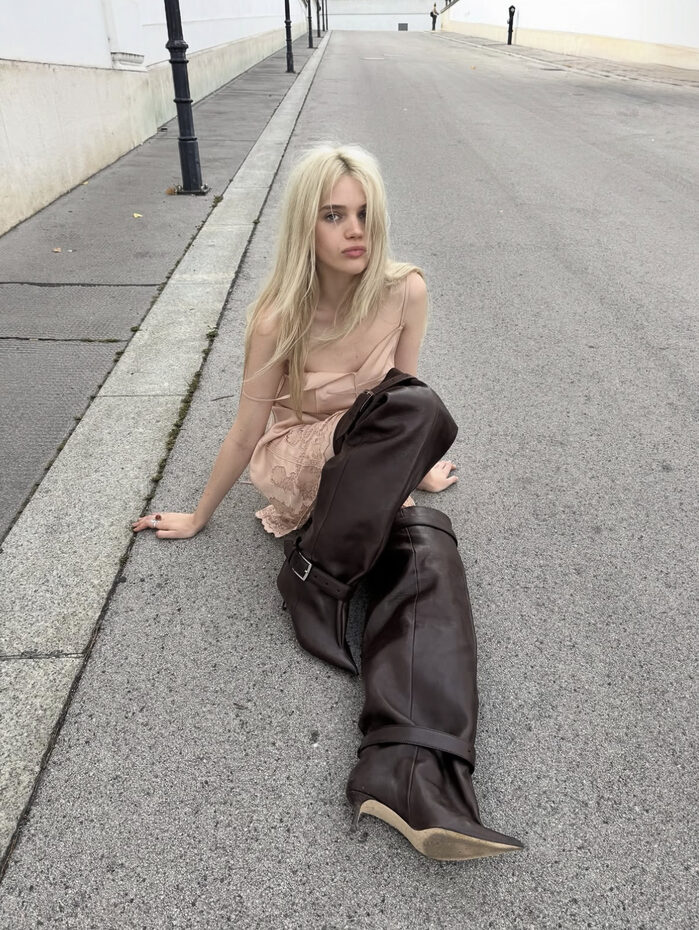그리고 최근에 특히 피셔맨 부츠 스타일이 눈에 띄게 많아졌습니다. 길고 헐렁한 실루엣의 부츠를 무릎 위로 잔뜩 올려신는 것인데요. 다리에 밀착되지 않고 아래로는 따로 연출하지 않아도 멋스럽게 주름이 잡히기 때문에, 무게감은 있되 시크하게 스타일링이 가능하죠.