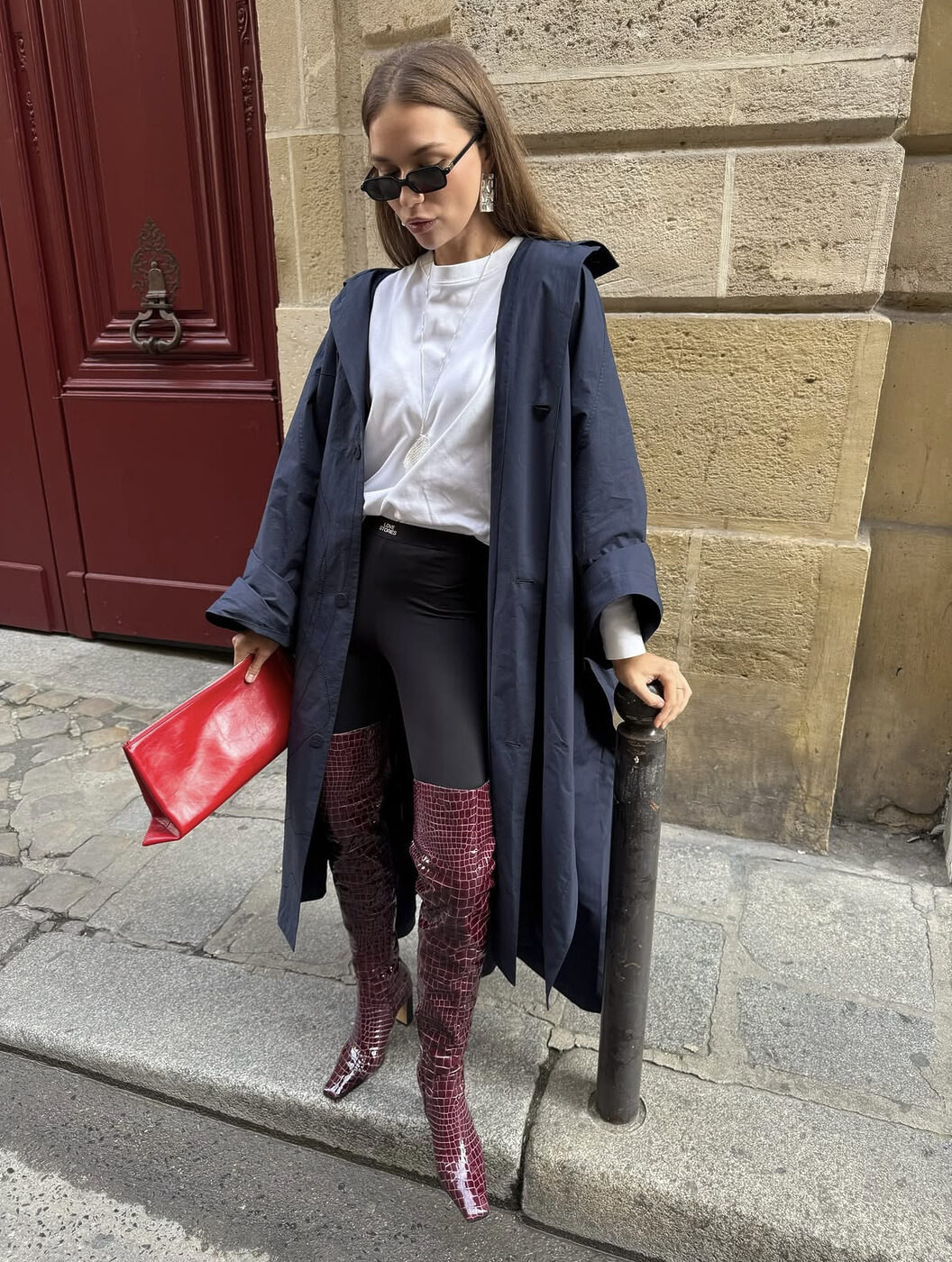 품이 넉넉한 니하이나 싸이하이 부츠가 아닌 핏이 타이트하게 붙는 부츠는 또 다른 무드를 자아냅니다. 부피감 대신 라인이 더 강조되니 날렵하고 정제된 느낌이 들기도 하죠. 블랙 레깅스, 이너로는 하얀색 티셔츠로 시크한 베이스를 다져준 다음, 버건디 크록 엠보 하이 부츠를 주인공으로 한 알렉산드라 룩도 참고해보는 건 어떨까요. 상의는 넉넉한 품으로 무게를 분산시켜야 더 세련되보일 수 있으니 기억하시길!