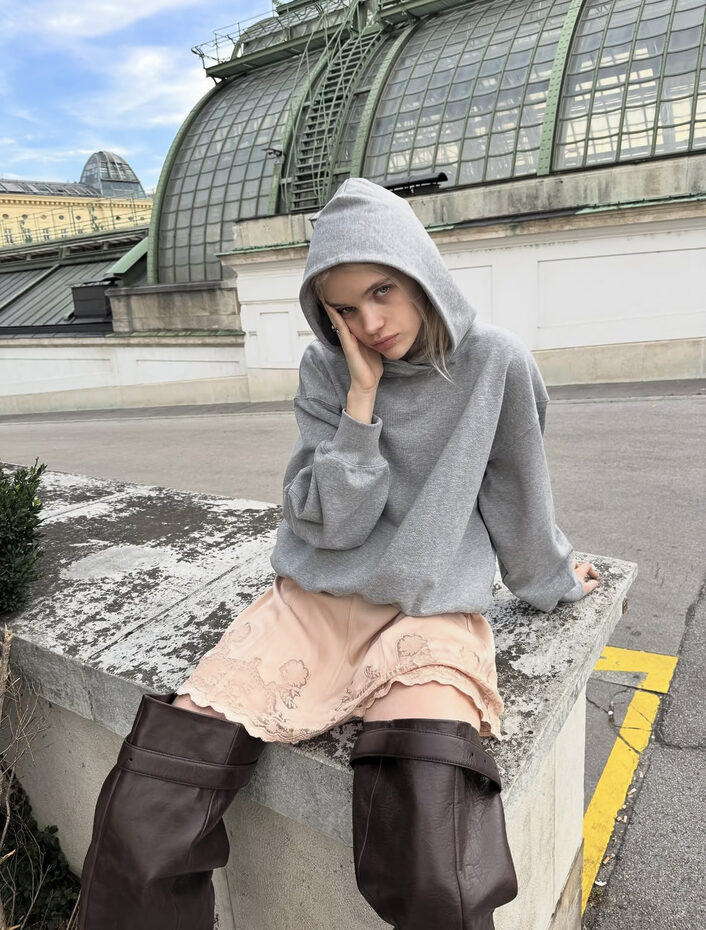 로맨틱함을 더하려면 이렇게 하면 됩니다. 레이스 슬립을 활용하고, 전체적인 색감은 부드럽게 브라운이나 톤온톤으로 떨어지게 하는 거예요. 소재의 색감 대비가 있어 옷차림이 더 다채로워지기도 합니다. 부츠의 질감이 실키한 이너의 너무 가벼워보이는 재질을 단단하게 잡아주니 계절감에 있어서도 자유롭습니다. 여기에 후디나 스웨트 셔츠로 꾸안꾸 터치를 더해보세요.