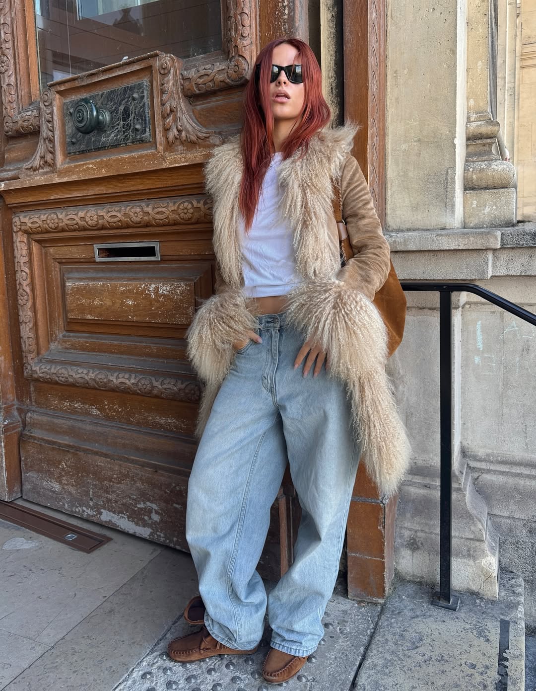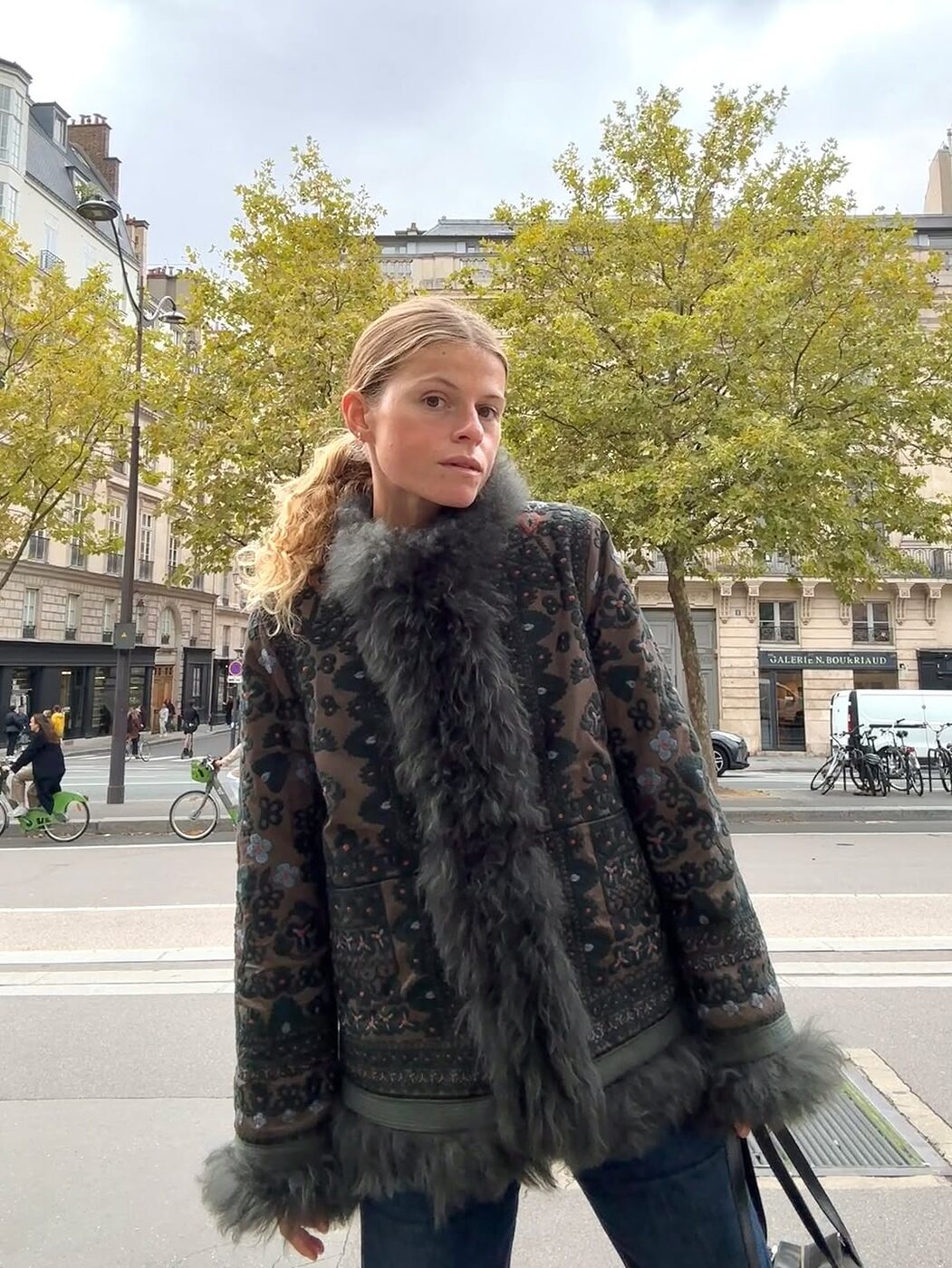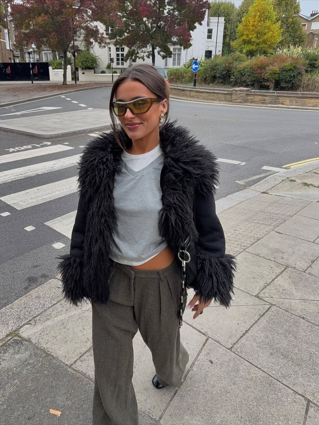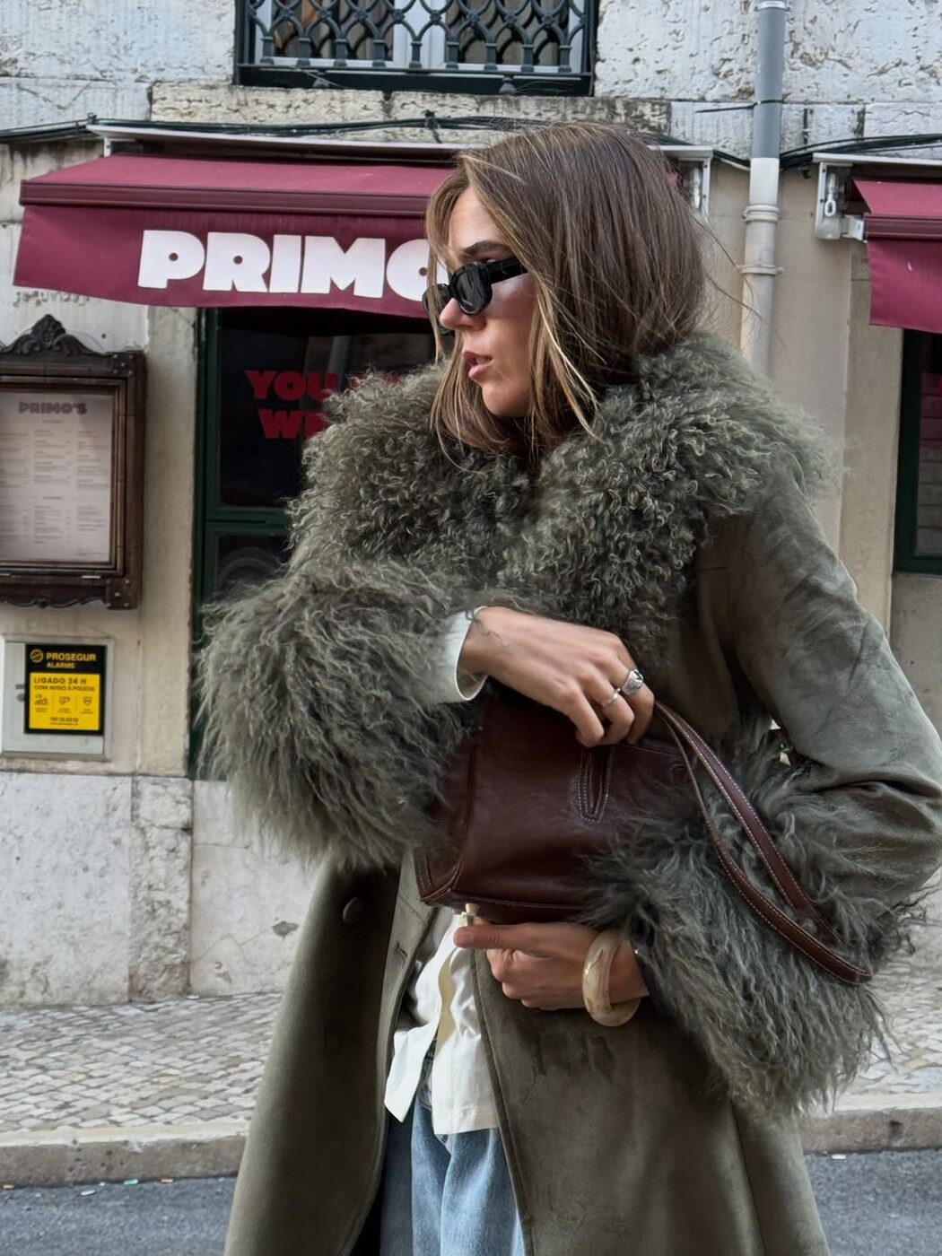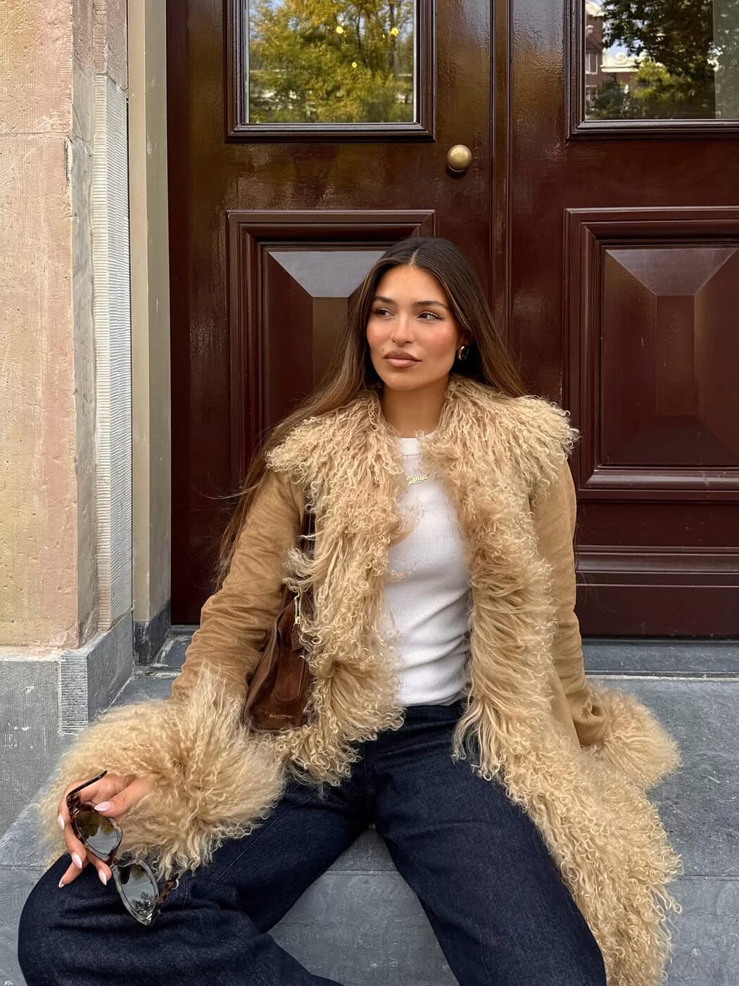 또 하나의 매력은 어떤 아이템과 매치하느냐에 따라 분위기가 달라진다는 거예요. 니트나 데님처럼 캐주얼한 아이템에는 빈티지하게, 원피스나 슬랙스 같은 포멀한 아이템에는 살짝 글래머러스한 무드로 연출할 수 있죠. 이렇게 다양한 무드를 소화할 수 있다는게 바로 퍼 트리밍 코트가 가진 큰 강점이에요.