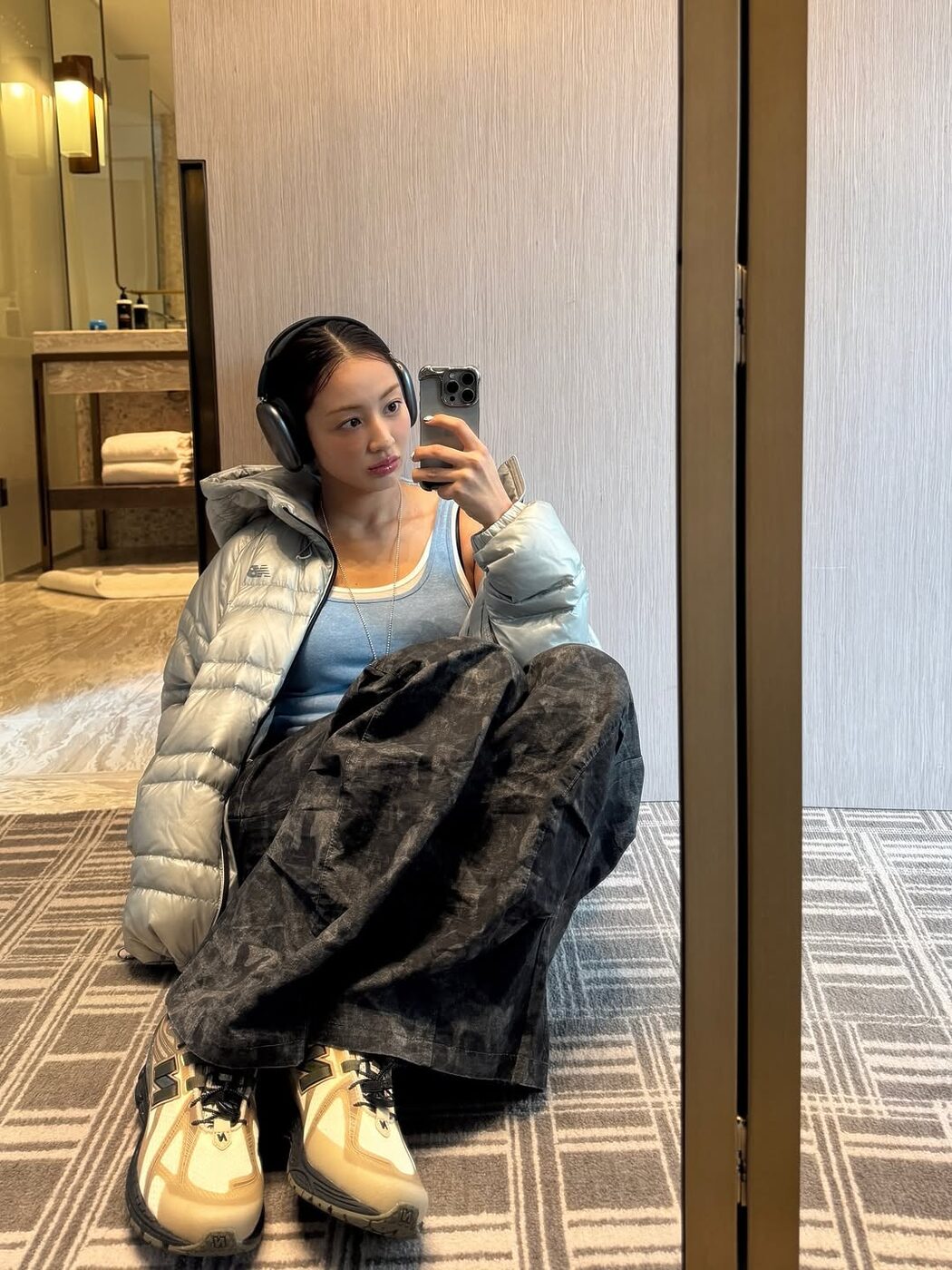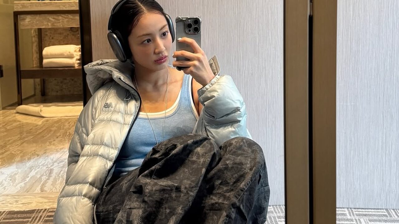 윈터는 메탈릭한 광택이 돋보이는 실버 컬러의 경량 패딩 룩을 보여줬습니다. 최근 젠지 세대에게 특히 주목받는 컬러이기도 하죠. 화이트나 블랙처럼 평범하지 않으면서도 의외로 과하지 않은 컬러이기 때문에, 비비드한 색이 부담스러울 때 도전해 보기 좋겠어요.