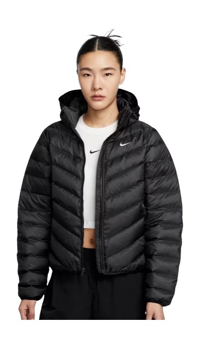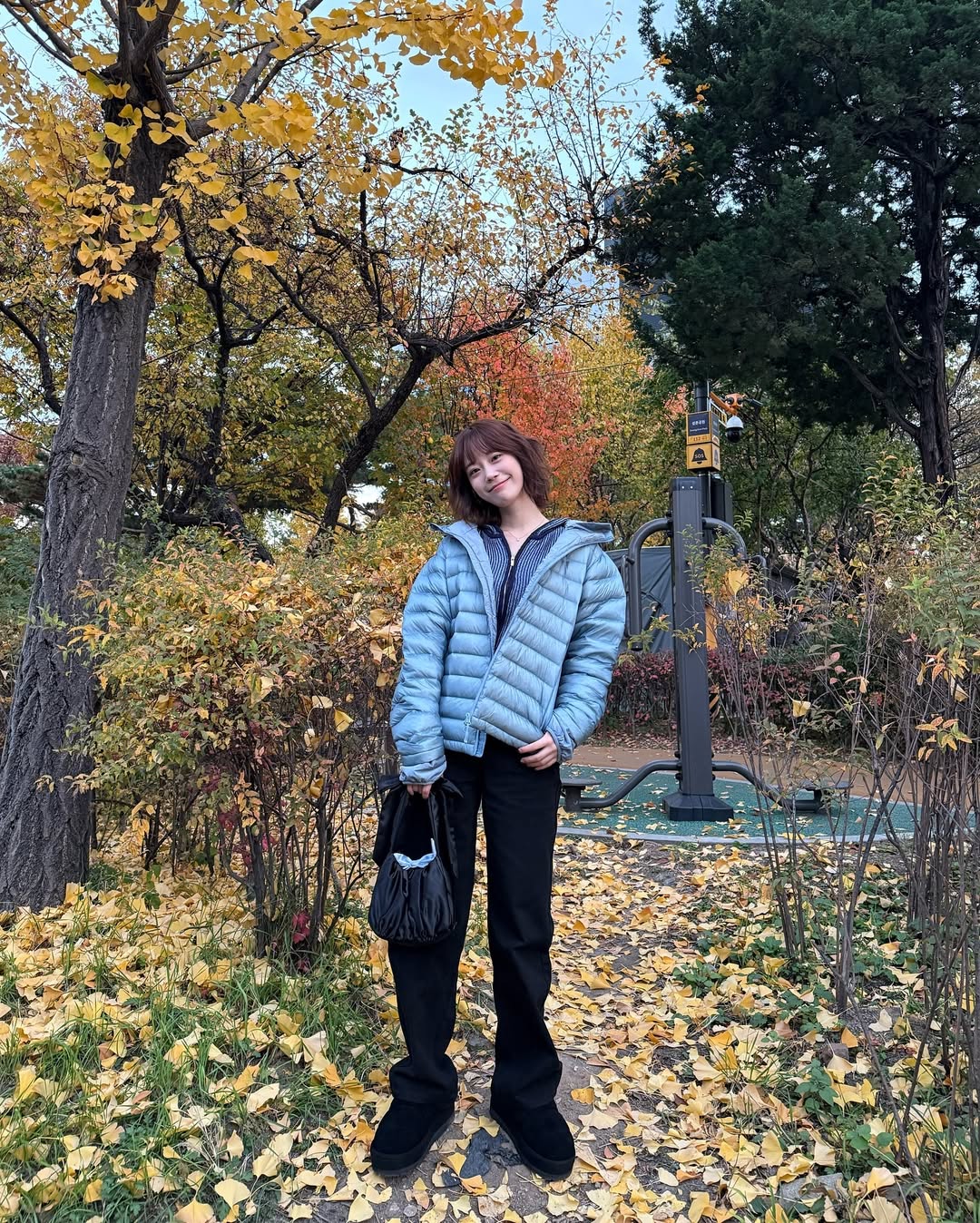 실버 경량 패딩은 힙한 스타일링에도 활용하기 좋죠. 지효는 와이드 팬츠에 슬리브리스 톱을 더하고 스니커즈로 마무리해 스트리트 룩을 연출했습니다. 편안한 레깅스나 스웻 팬츠를 매치하면 아웃도어 룩으로도 충분히 소화할 수 있겠죠.