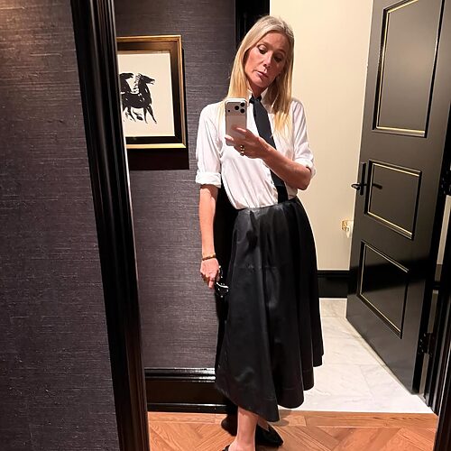 빨간 가죽 스커트에 버튼업 카디건으로 시크한 오라를 자아낸 배우 테사 톰슨. 앞코가 길게 빠진 실루엣에 골드 체인 장식이 더해진 펌프스가 룩에 포인트가 되어주는데요. 스커트 컬러와도 자연스럽게 어우러지면서, 낮은 굽이 주는 우아함이 전체 실루엣에 한층 세련된 밸런스를 더했죠.