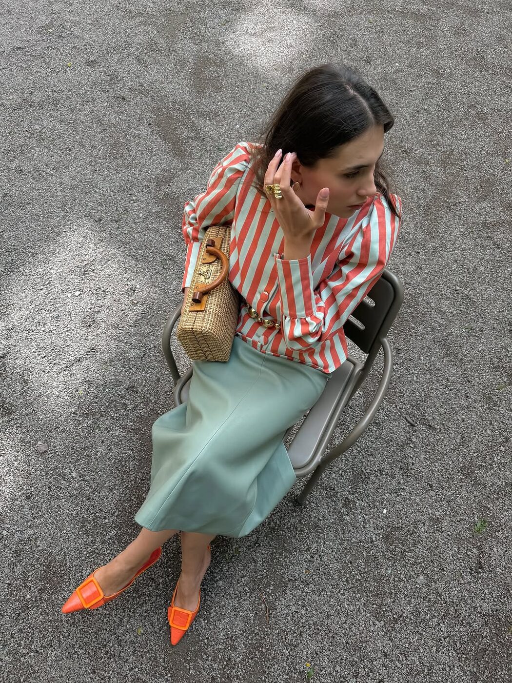 민트, 오렌지, 코랄 컬러로 레트로한 분위기를 연출한 룩. 풍부하지만 과하지 않은 색감이 시선을 끄는데요. 발등을 드러내는 스틸레토 쉐입의 뮬에 벨트 디테일이 구조적인 포인트를 완성했어요. 셔츠와 톤을 맞춘 비비드한 오렌지 컬러의 뮬이 룩 전체에 통일감을 더하네요.