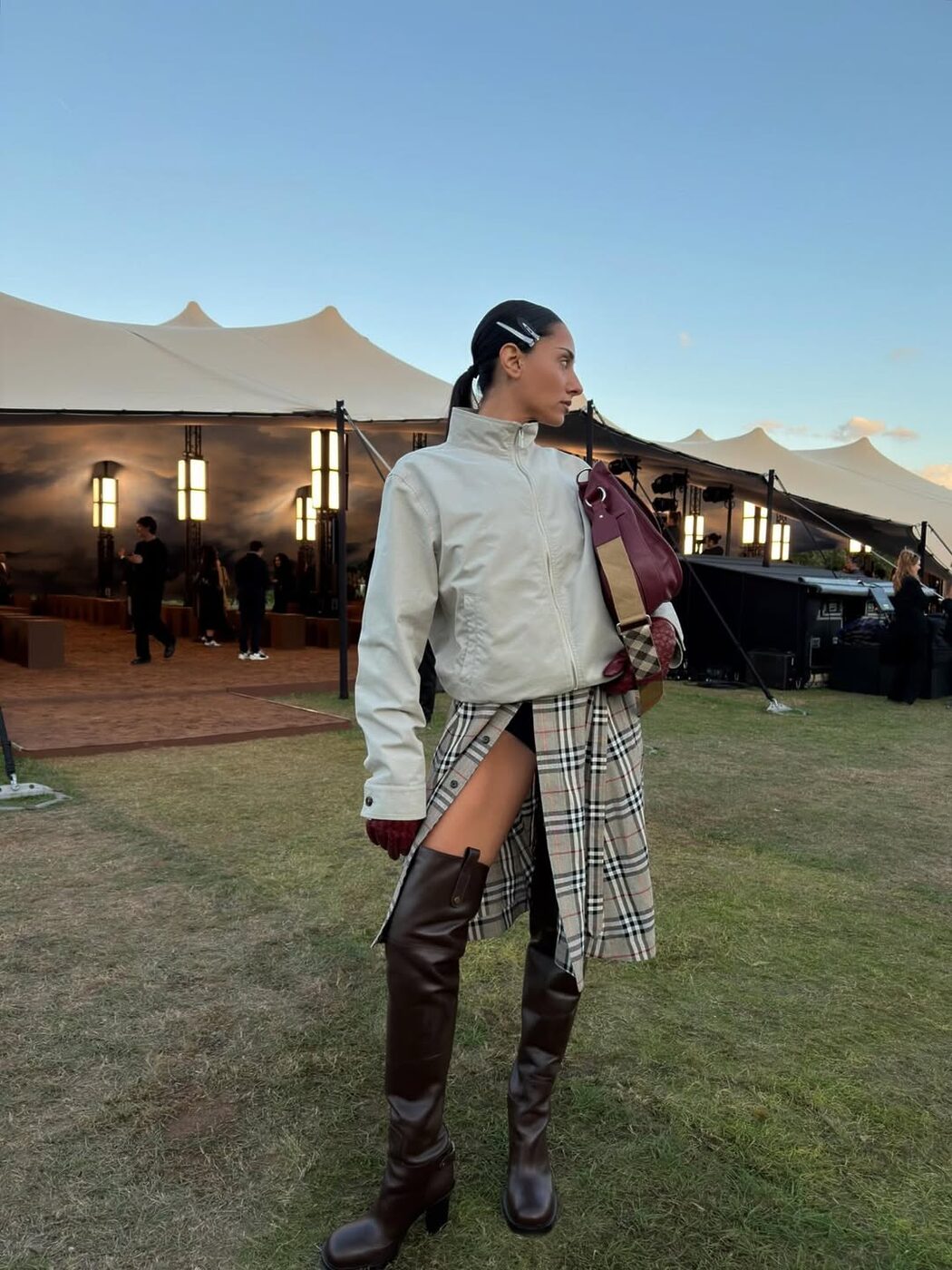 깊은 슬릿이 들어간 미디 스커트에는 긴 부츠를 활용해 보세요. 무릎 위로 올라오는 싸이하이 부츠를 더하니 상하의 비율도 훨씬 안정적이어 보입니다. 다리 라인도 강조되어서 시각적으로 날씬해보이죠.
