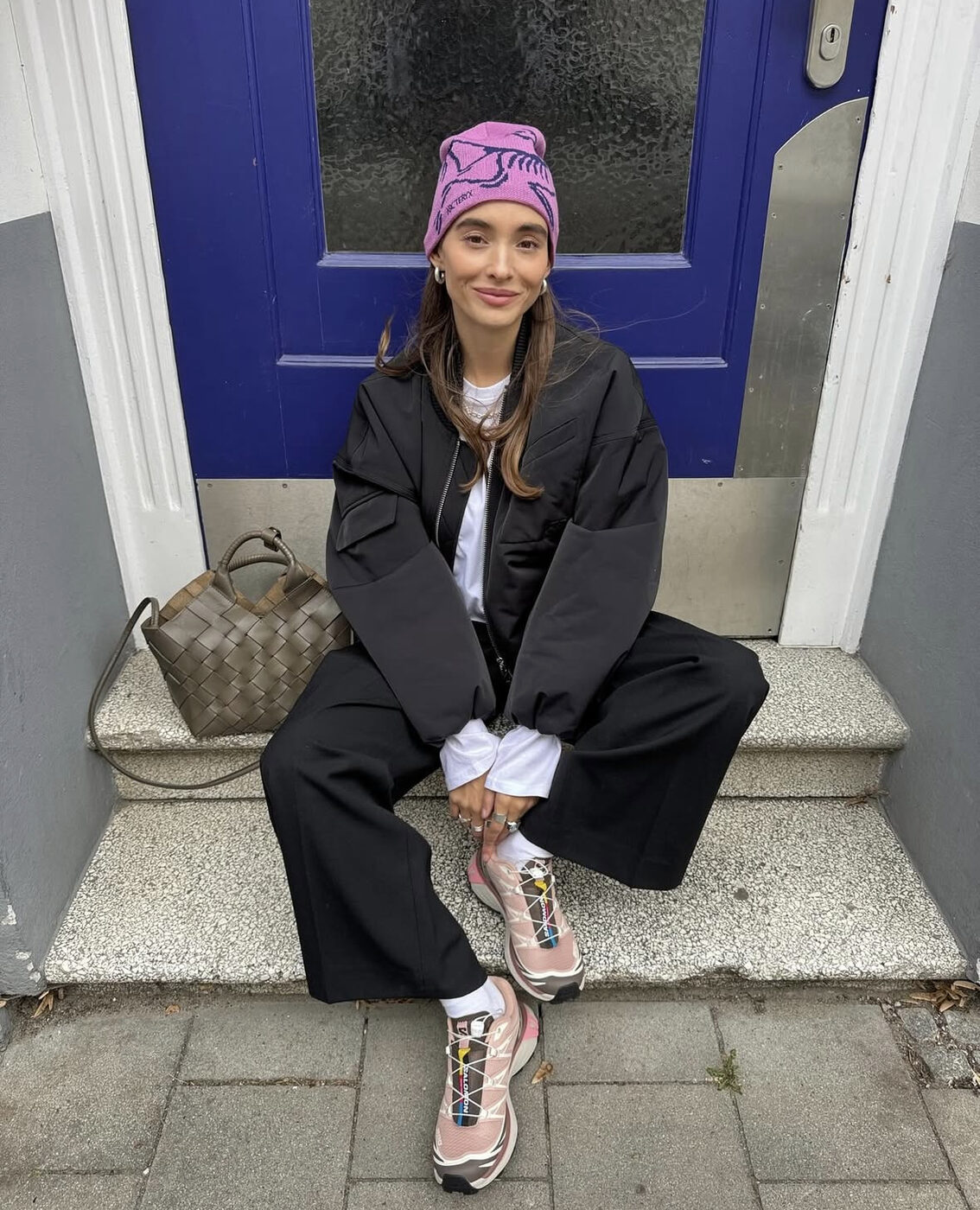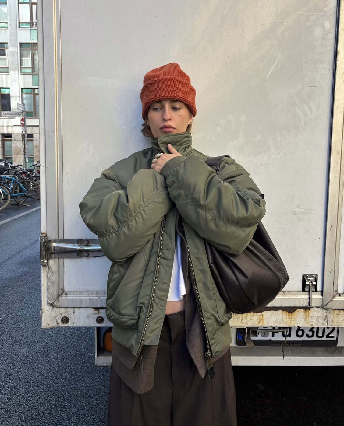 그리고 겨울철 봄버 재킷 룩에서 빠질 수 없는 짝꿍이 있죠. 모두가 예상하듯이 역시 비니입니다. 봄버의 부피감을 맞춰주는 역할도 할 뿐더러 칼바람이 부는 날씨에 귀까지 추위를 완벽차단할 수 있는 알차디 알찬 아이템이기도 합니다. 특히 크게 접어 올린 도톰한 비니는 머리가 작아보이게 하는 효과까지 있으니, 추운 날일수록 챙겨야 할 이유가 충분하죠.