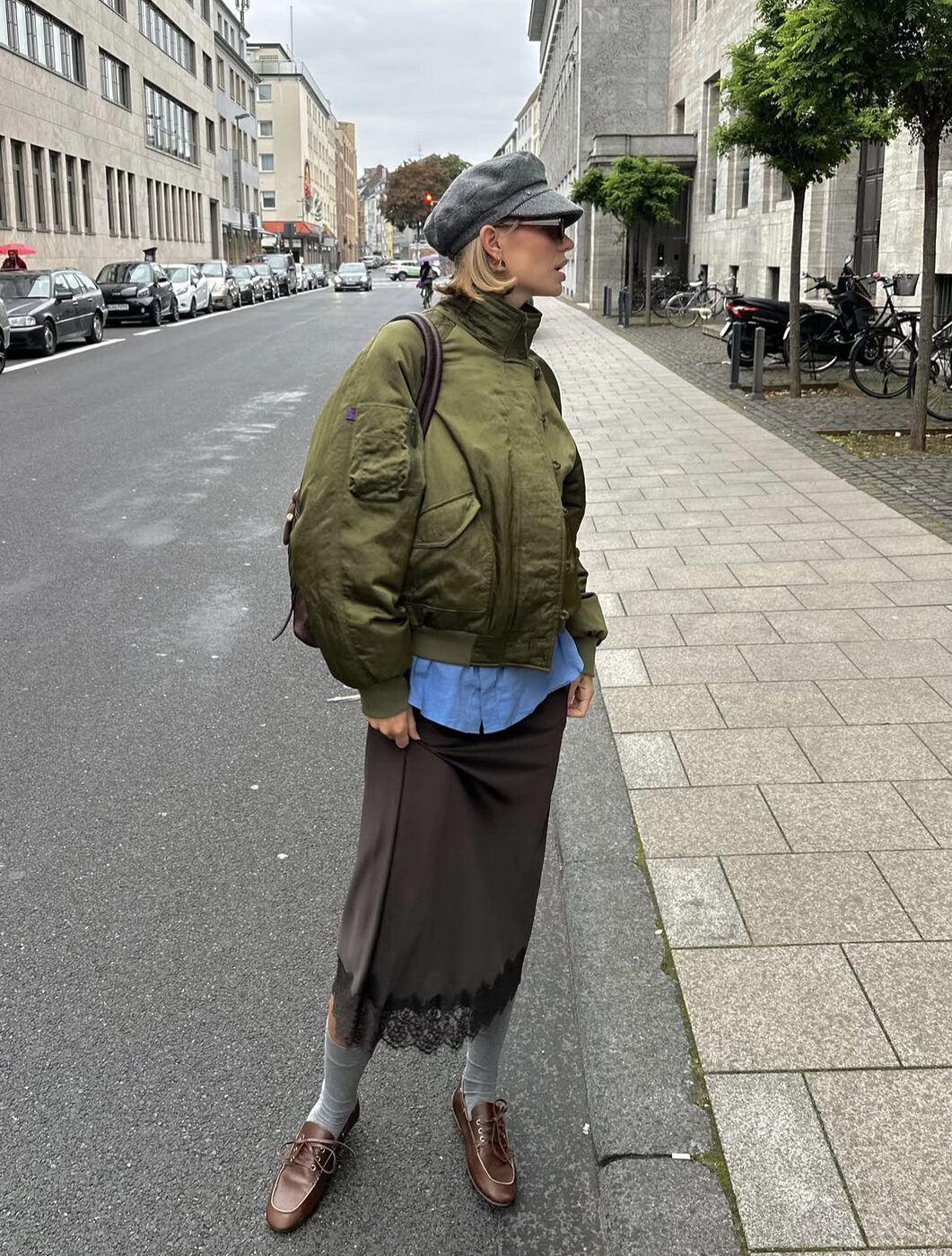 두꺼운 코트나 패딩 대신, 봄버 재킷으로도 충분히 겨울을 날 수 있는 이유가 되는 룩이네요. 겉은 바삭하고 속은 따뜻한, 적당히 부피감 있는 실루엣이 이너로 어떤 것을 걸쳐도 태가 납니다. 다른 방한 아우터에 비해 활동적이고, 여유로워서 이너를 다양하게 조합할 수 있다는 것도 장점이죠. 패션 인플루언서 린다는 이너로 셔츠와 슬립 드레스를 레이어링해주고, 종아리까지 오는 양말과 울베레로 보온을 더했습니다. 부피감은 있으나 아래로 이어지는 새틴 스커트가 꽤나 경쾌한 모양새를 만들어주기도 하네요.