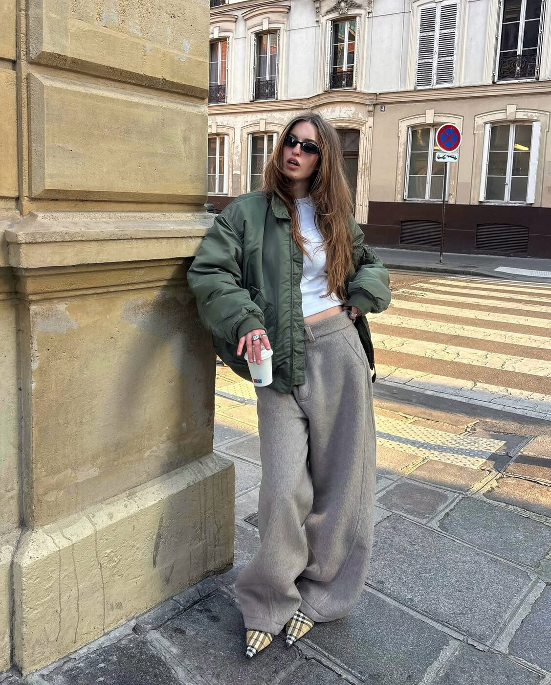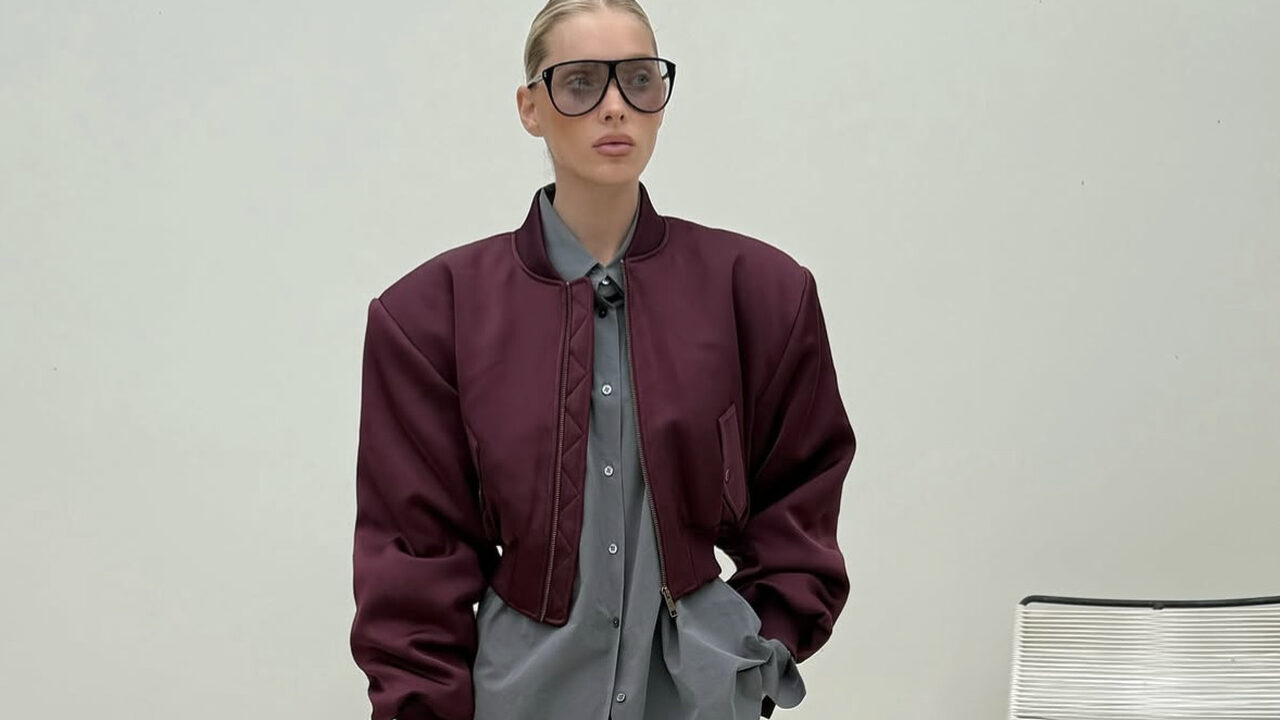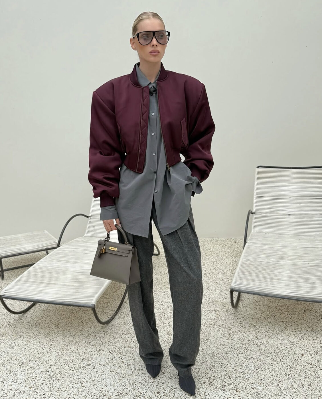 출근 룩으로도 손색 없죠. 정제된 색감과 실루엣만 챙긴다면요. 제아무리 짧은 기장의 봄버라도, 품위 있는 그레이 컬러를 만나니 깡총한 무드가 꽤나 조용해집니다. 차분한 회색 톤으로 중심을 잡고, 그 위에는 깊이 있는 색감의 버건디 컬러로 완급을 더해준 엘사 호스크의 센스가 돋보이네요. 덕분에 이너는 포멀한 조합이지만 세련된 느낌이랄까요?
