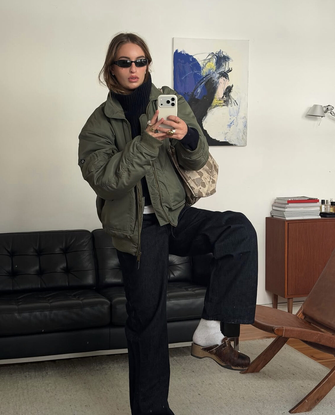 머지 않은 겨울 봄버 룩의 이너로는 터틀넥과 티셔츠를 겹쳐 입는 방법을 추천해요. 한겨울까지 입기 위해선, 안쪽의 체온 조절이 중요하니까요. 터틀넥만 입는 것도 좋지만, 답답해보이기 쉽기 때문에 안에 얇은 티셔츠를 입고 살짝 보이게 꺼내주면 레이어링의 깊이도 생기고 보온은 더 올라가겠죠. 봄버 재킷의 밀리터리 무드도 좀더 부드러워질테고요.
