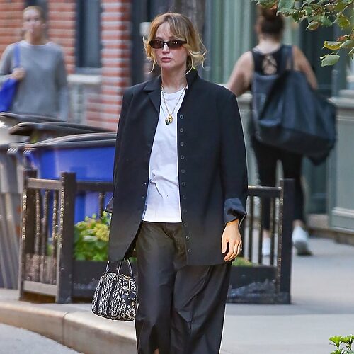 어깨가 강조된 머스큘린 무드의 롱 코트는 오버사이즈 실루엣에 커다란 칼라와 더블 브레스트 디테일로 멋스러움을 강조했어요. 미니멀하고 심플한 코트 아래엔 바닥을 쓸다 못해 마치 물 웅덩이가 고인 듯 루스하게 흘러내린 퍼들 팬츠의 밑단이 돋보였죠. 한층 더 나아가 형태가 큰 슈즈가 아닌 바닥에 밀착된 형태의 슬림하고 심플한 블랙 앵클 부츠로 트렌디함의 정점을 찍은 제니퍼 로렌스.