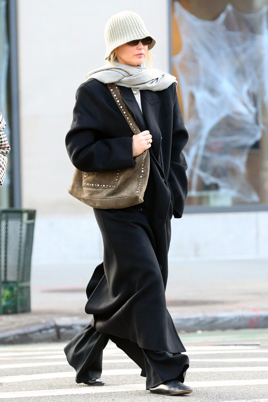 그녀의 본격적인 겨울 준비는 여기서 끝이 아닙니다. 온통 블랙인 옷차림에 뉴트럴 톤의 골지 니트 모자와 스카프로 컬러 밸런스를 맞추었어요. 버킷 햇 스타일의 둥그런 모자는 부드럽고 따스한 분위기를 선사했죠. 스카프 또한 앞에서 뒤로, 휙 둘러 힘들이지 않은 에포리스 시크 무드를 연출했어요. 여기엔 스터드가 장식된 스웨이드 백으로 시니컬한 뉴요커에 자유로운 보헤미안 감성 한 스푼을 더했답니다. 올겨울, 뭘 입어야 할지 고민될 땐 제니퍼 로렌스처럼 귀여운 니트 모자에 박시한 롱 코트가 최고의 선택이 될 거예요.