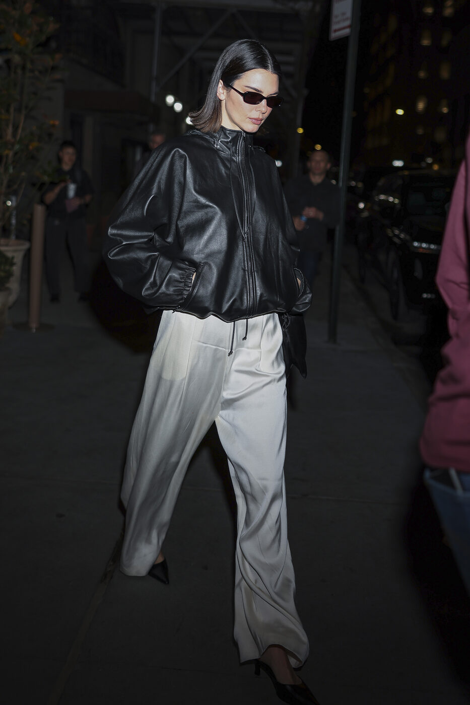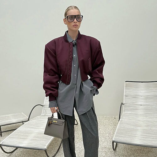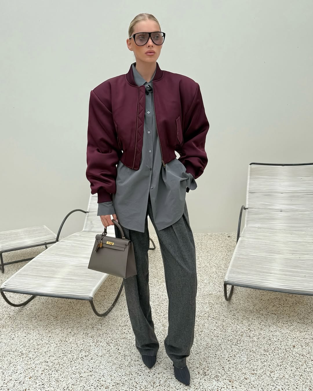 좀 더 세련되게 봄버 재킷을 스타일링하고 싶다면 켄달 제너와 엘사 호스크처럼 그레이 컬러 슬랙스를 매치해보세요. 두 사람의 스타일은 닮은 듯 다르지만, 공통점은 볼륨감 있는 짧은 봄버 재킷과 그레이 슬랙스를 선택한 것이죠. 이 조합은 룩을 단숨에 모던하고 고급스러운 분위기로 바꿔줍니다. 마지막으로 심플한 이너와 하이힐까지 더하면 출근 룩으로도 손색없어요.