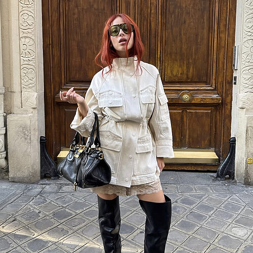 일자로 떨어지는 싱글 코트에 마이크로 쇼츠 조합은 이 계절에 시도할 수 있는 가장 세련된 무드를 보여줍니다. 무릎 아래까지 오는 브라운 부츠를 더한 것도 하의 실종 룩에 강도를 적당히 조절해주면서 다리를 더 길어보이게 만들고 얇아보이게 하는 효과를 자아내죠. 회색 비니와 틴티드 선글라스로 포인트를 더한 것도 인상적이고요. 컬러 톤을 차분한 브라운과 레드 톤으로 통일감을 준 것도 영리합니다. 차분한 컬러를 내세우면서 과감하게 쇼츠를 입는 용기, 한번쯤은 발휘해도 좋겠죠.