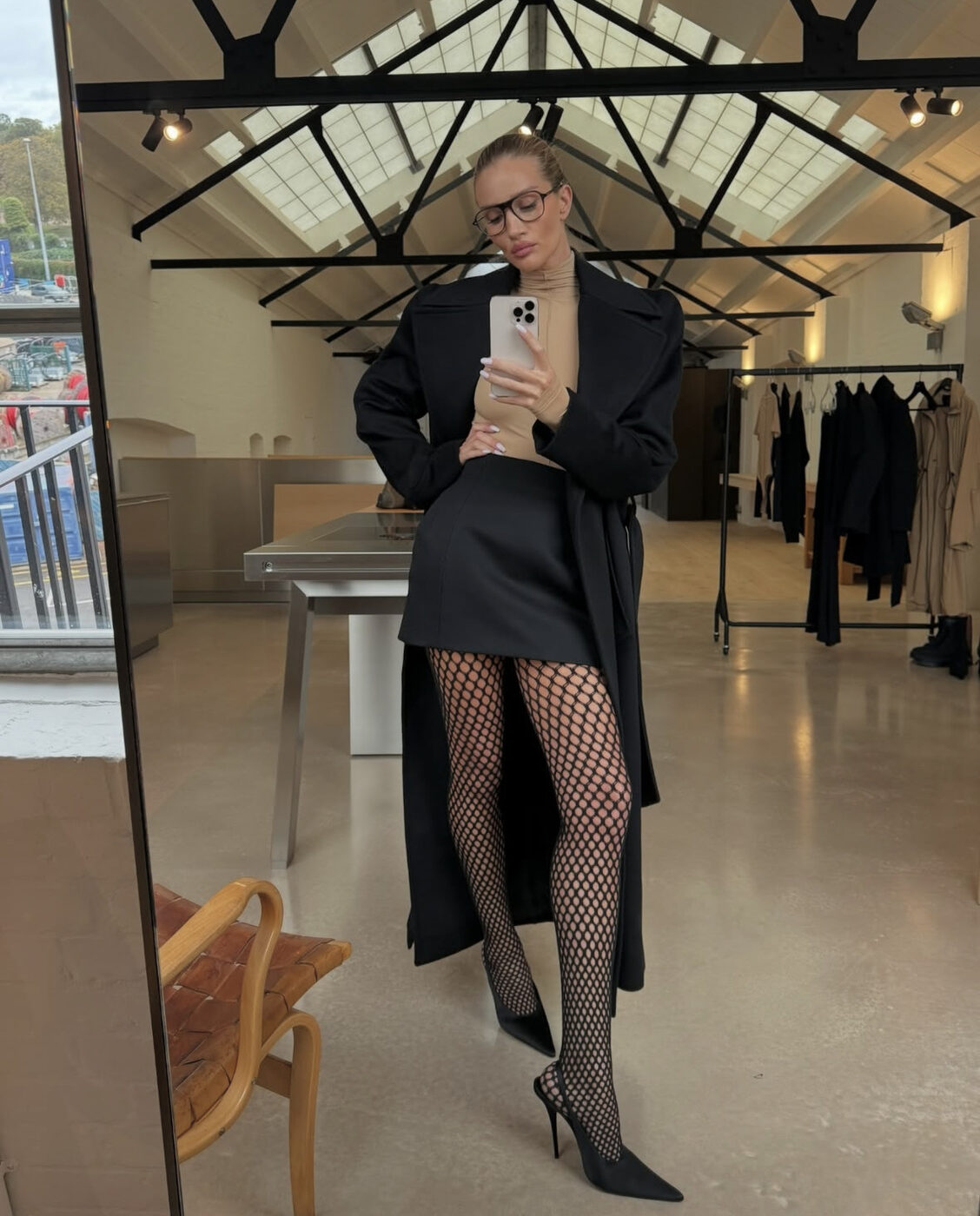 세련을 넘어서 테토미가 가미된 스타일링을 보여준 로지의 강인한 조합은 어떨까요? 힐을 안 신었다면 빗자루가 됐을 법한 길이의 블랙 코트와 블랙 미니 스커트, 도발적인 높이의 스틸레토 힐, 그리고 화룡점정을 찍는 매시 스타킹을 더해 시크함을 제대로 끌어올렸습니다. 이너를 누디한 컬러의 터틀넥으로 튀지 않게 매치한 것도 포인트겠고요. 그리고 롱 코트를 입을 땐 이렇게 이너를 다 보이도록 활짝 오픈해야 이 조합의 매력이 제대로 드러납니다.