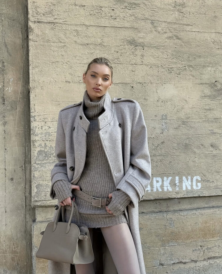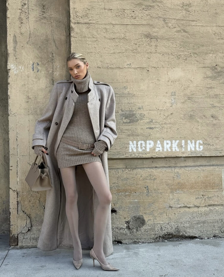 롱 코트와 함께라면 아찔한 미니 드레스도 한결 마음 편히 입을 수 있습니다. 같은 톤으로 이뤄져 있다면 더할 나위 없겠죠. 원톤의 매력은 차분함에서 나오는 우아함인데 엘사 호스크의 룩이 그 예시가 됩니다. 머리부터 발끝까지 회끼가 도는 토프 톤으로 맞추고, 스타킹 역시 비슷한 컬러군을 선택해 스킨 톤을 싹 덮어준 점이 특히 센스있죠. 다만 원톤에도 한 끗은 필요합니다. 같은 톤이지만 소재의 결을 모두 달리해 덩어리지는 것을 피했고, 드레스 중간에 더한 벨트가 허리선을 잡아주며 길쭉해보이는 비율을 다잡아준 것을 기억하세요.