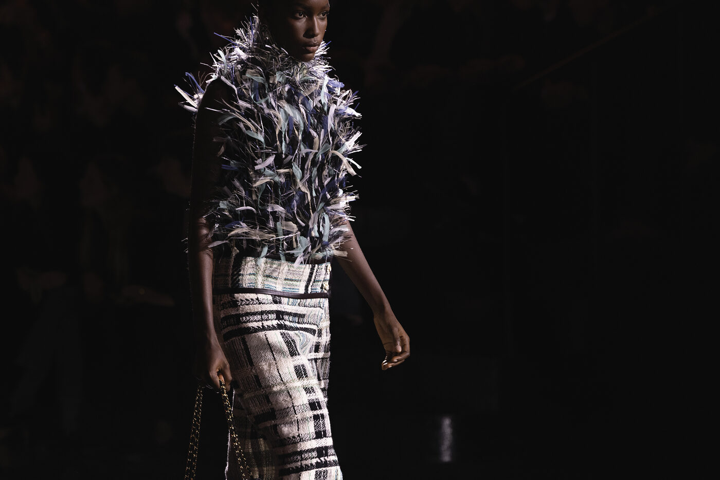 샤넬의 아이코닉한 트위드 슈트에 대한 재해석은 쇼 후반부에 집중적으로 드러났다. 트위드 슈트는 손뜨개 니트, 비즈 장식, 시스루 등 실험적인 직조 방식을 통해 모던하게 변주됐다. 비즈를 하나하나 촘촘히 넣은 체크 패턴의 트위드 슈트는 멀리서 보면 일반 트위드처럼 보이는 트롱프뢰유 효과로 마티유 블라지 특유의 위트를 드러냈다. 트위드 슈트 안쪽에 다른 프린트의 실크 안감을 덧대어 드라마틱한 대비를 준 것도 트위드 슈트에 신선한 리듬을 부여했다.