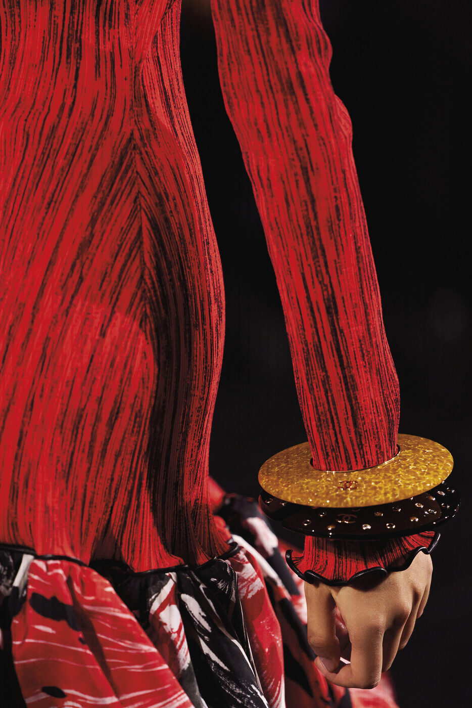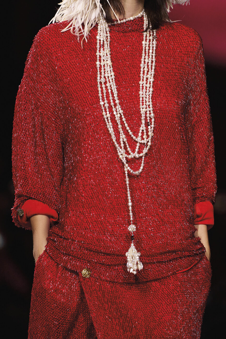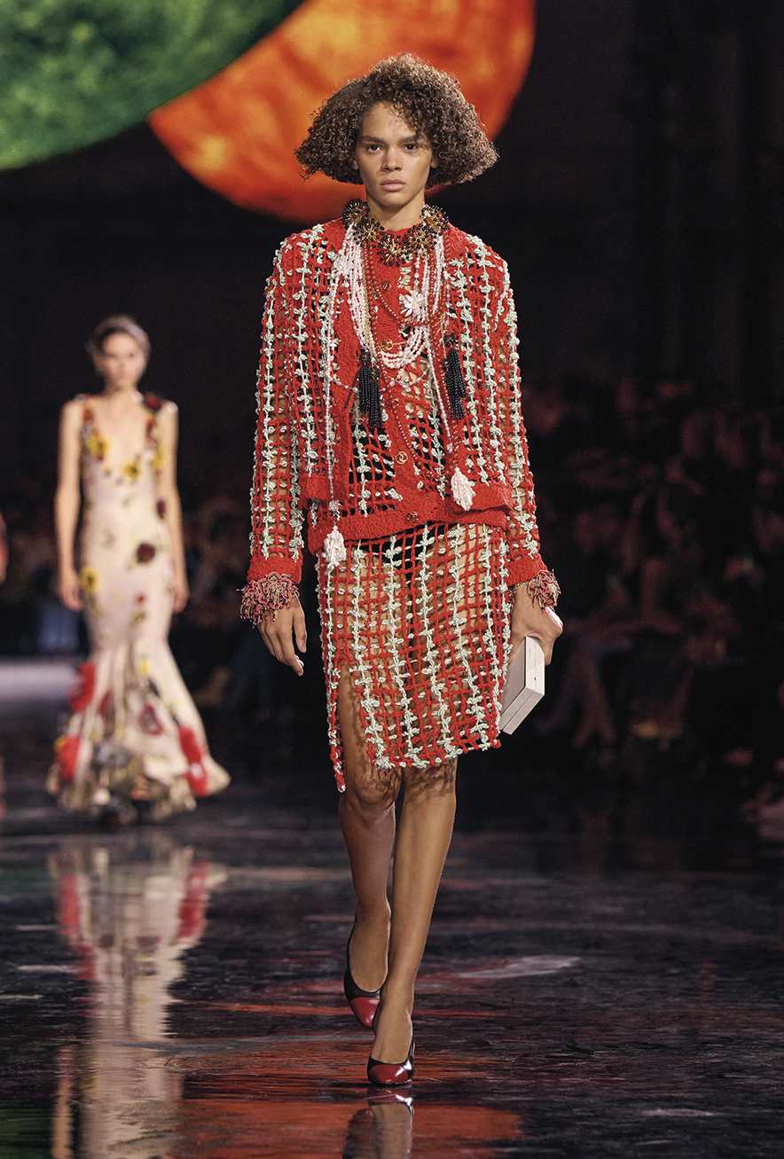 샤넬이 오랫동안 ‘메티에 다르(Métiers d’art)’에 투자해 구축한 공방 네트워크는 마티유 블라지의 창작 세계에 또 다른 토대가 됐다. 그는 아틀리에와 함께 새로운 소재 개발에 집중했다. 그 결과 투피스 스커트 슈트는 어느 때보다 날아갈 듯 가벼워졌고, 샤넬의 상징인 까멜리아, 바로크 진주, 밀단 모티프는 조각처럼 정교하게 거듭났다. 특히, 까멜리아는 스커트와 재킷에 예상치 못할 정도로 거대한 아플리케로 피어나거나, 단출하게 니트 슈트에 장식되기도 했다. 화성처럼 이글거리는 레드 컬러 니트 셋업, 감각적인 깃털 장식 볼륨 스커트, 골드 부클레가 반짝이는 니트 슈트 등은 생생하고 야성적인 질감이 돋보였다. 가브리엘 샤넬이 ‘발명’했다고 잘 알려진 리틀 블랙 드레스조차 금색 밀 이삭 장식이나 주름 등을 넣어 세련되게 변주됐다.