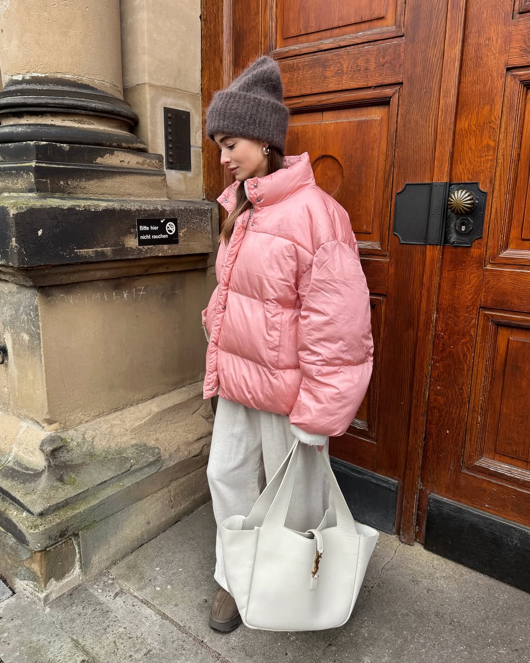 이제 한 단계 더 나아가 핑크 톤 패딩에 도전해보세요. 채도가 높은 쨍한 핑크보다는 더스티 핑크, 로즈 핑크, 베이비 핑크처럼 은은하고 세련된 색감을 고르면 어렵지 않게 스타일링 할 수 있어요.