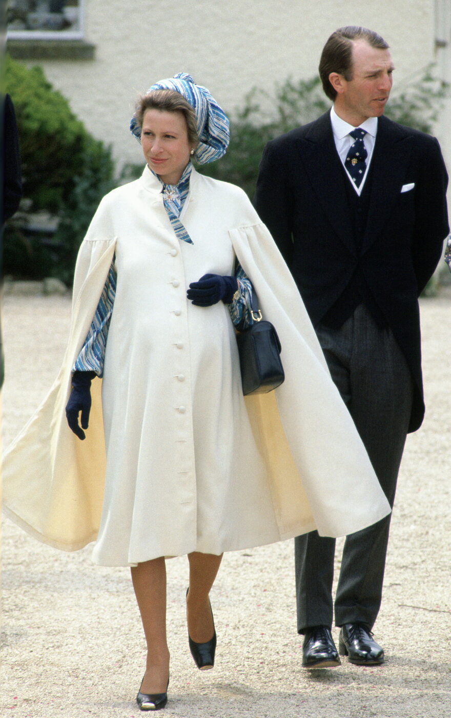 앤 공주의 임산부 패션 또한 눈길을 사로잡습니다. 화려한 블루 패턴의 블라우스와 그와 매칭을 이루는 스카프 모자를 쓴 공주님은 그 위에 커다란 크림색 케이프를 둘러 영리하고도 우아한 임부 패션을 완성했어요. 블랙 펌프스와 토트 백이 기품 넘치는 스타일링을 완성합니다.