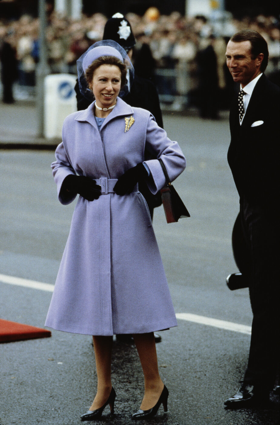 케이트 왕세자비가 주로 선보이는 원피스 형태의 코트 또한 앤 공주가 즐겨 입던 스타일이예요. 연한 보라색의 A 라인 코트는 커다란 벨트로 여성스러움을 강조하기도 합니다. 같은 색의 망사가 더해진 필박스 모자를 쓰고 로열의 상징과도 같은 블랙 글러브를 착용한 앤 공주. 화이트 초커와 브로치의 주얼리 매칭이 스타일리시함을 더하네요.