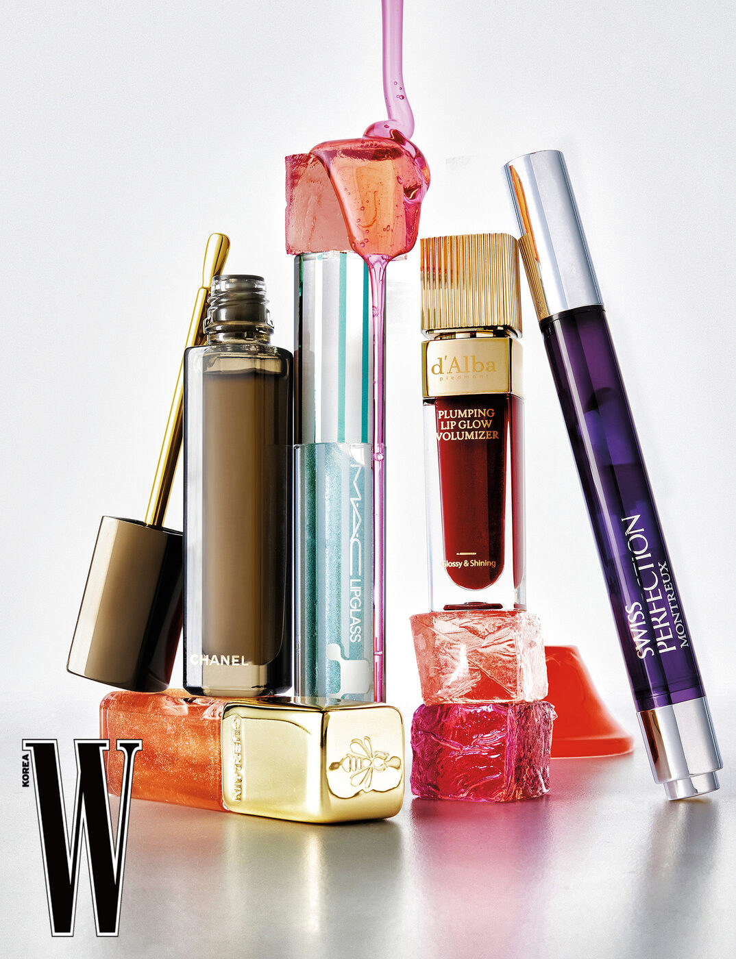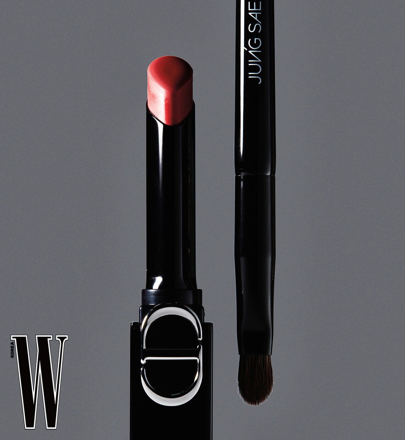 “립스틱의 텍스처가 촉촉할수록 립라인을 정교하게 표현해줄 도구가 필요하다. 입술 외곽선을 따라 바른 뒤, 라인을 자연스럽게 펼치며 안쪽까지 블렌딩해주면 세련된 글로시 립을 연출할 수 있다.” – 정연우(메이크업 아티스트)