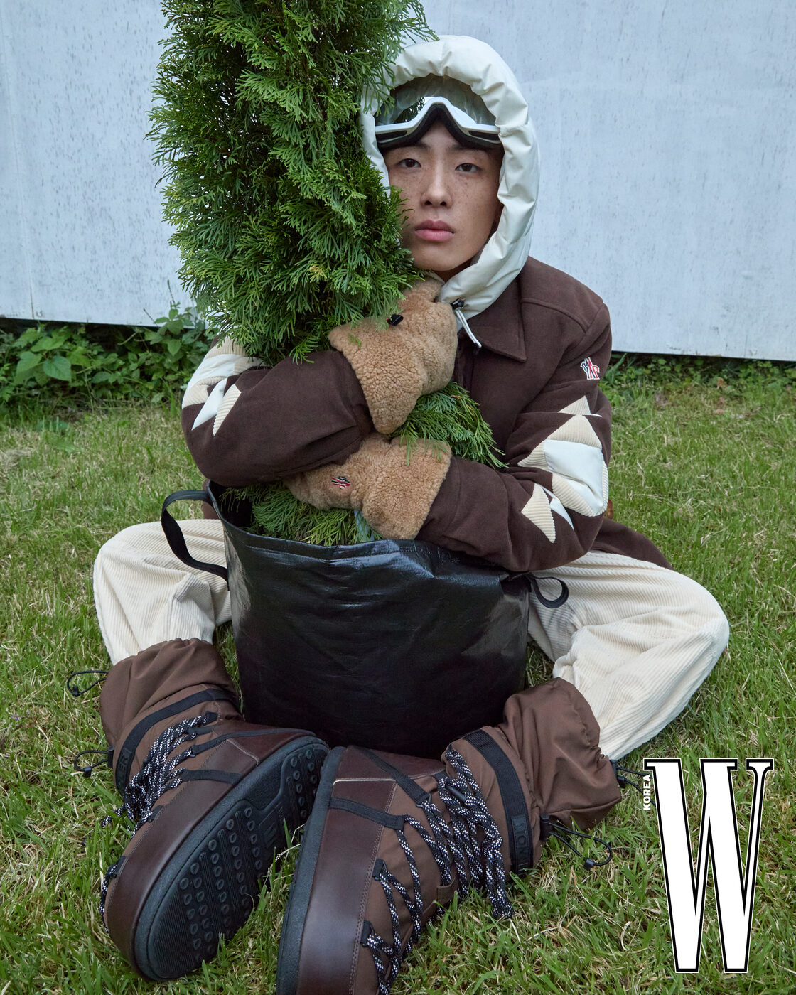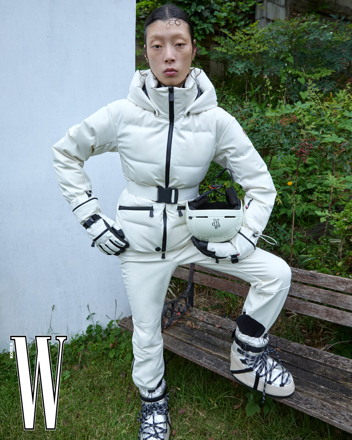 시어링 캡, 패치워크 다운 재킷, 스키 팬츠, 글러브, 스노 부츠는 몽클레르 그레노블 제품.