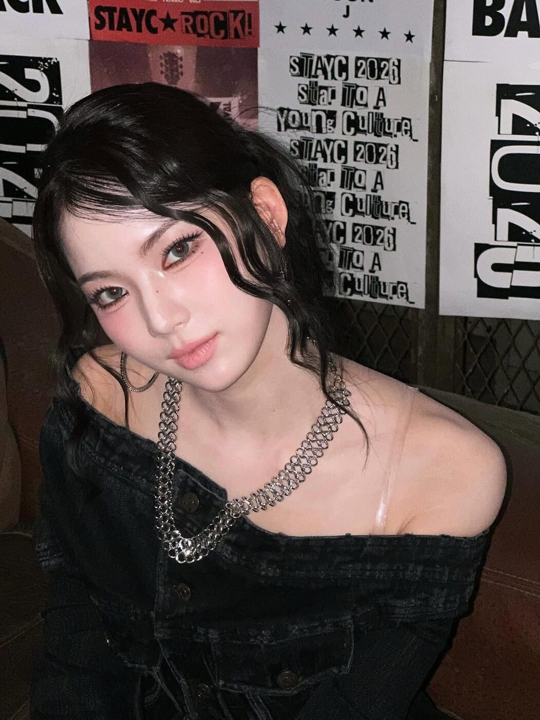 길게 내린 사이드 뱅에 얇은 물결 컬을 더한 스테이시 아사. 앞머리만 옆 가르마를 타 한층 입체적인 실루앳을 완성했습니다. 볼드한 실버 액세서리로 포인트를 준 펑키한 스타일링과도 잘 어우러지네요.