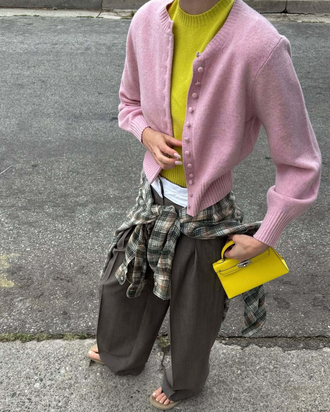 같은 아이템이라도 안에 입느냐 밖에 입느냐, 핑크색 니트 위에 레드 가디건을 걸치느냐 옐로우 가디건을 걸치느냐에 따라 완전히 다른 룩이 만들어져요. 이렇듯 니트 서너장만으로도, 색의 조합과 순서만 바는 것만으로도 다양한 스타일을 완성할 수 있을거예요.