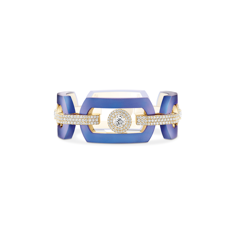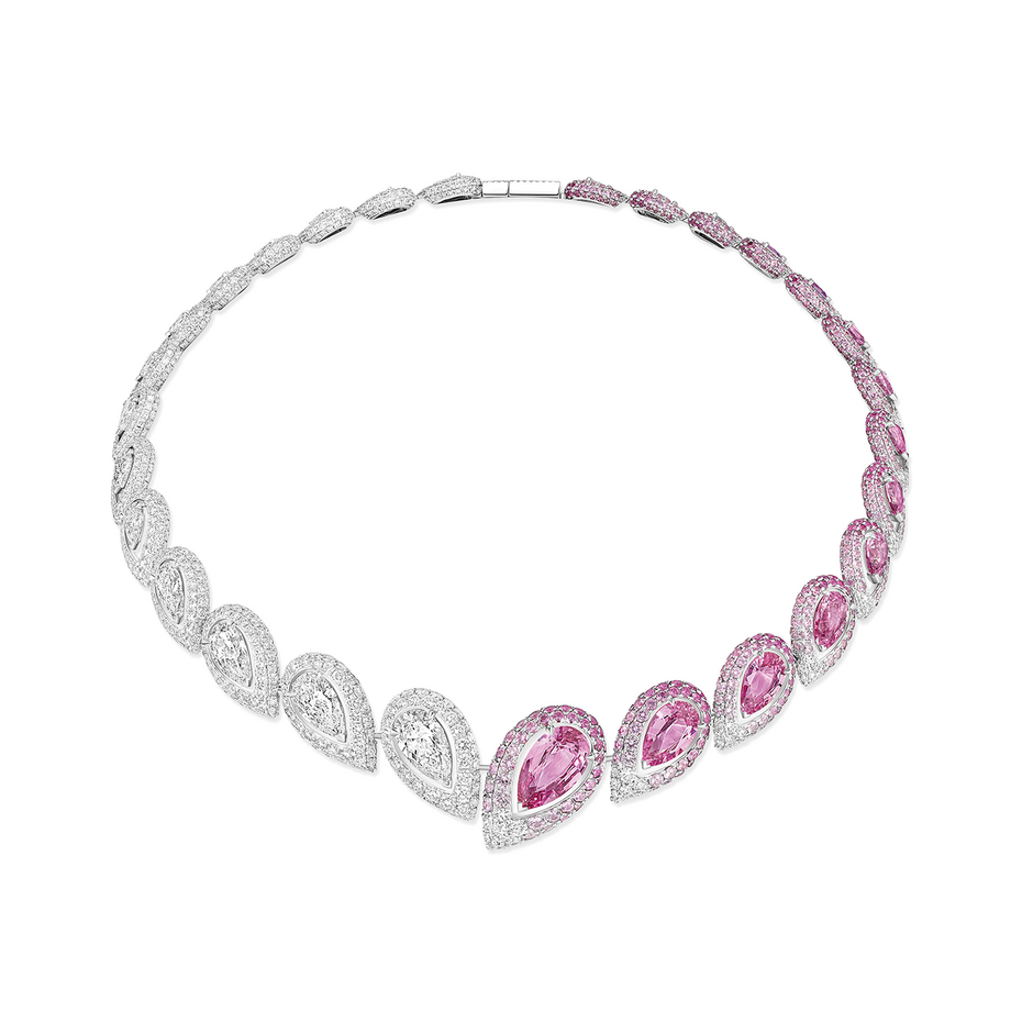 컬렉션은 프랑스어로 ‘본능의 대지’를 의미하는 떼흐 데땅스띡(Terres d’Instinct)이란 이름 아래 전개된다. 남부 아프리카의 신비로운 풍경, 불타는 태양 아래 빛나는 모래언덕, 야생 동물의 역동적인 모습을 담아냈다. 골드, 다이아몬드, 오닉스 소재로 구현한 과감한 실루엣과 기하학적인 패턴이 강렬하다. 여기서 가장 돋보이는 피스는 칼라하라 네크리스(Kalahara Necklace)다. 두 개의 옐로 다이아몬드를 세팅했는데, 그중 하나는 35캐럿에 달하며, 정교한 모듈형 구조를 적용하여 네 가지 형태로 변형하여 착용할 수 있다. 두 번째 챕터에서 공개된 컬렉션 일부는 아프리카 자연에서 영감받은 강렬한 색채가 더욱 돋보인다. 하늘을 닮은 블루 사파이어, 대지의 생명을 상징하는 차보라이트, 저무는 태양을 연상시키는 레드와 핑크 스피넬까지, 대담한 유색 보석을 사용한 것이 특징이다. 이는 창립 이후 다이아몬드를 주로 사용해온 메시카가 20주년을 맞아 스펙트럼을 확장하고 더 큰 미래를 향해 전진하려는 의지를 보여준다.