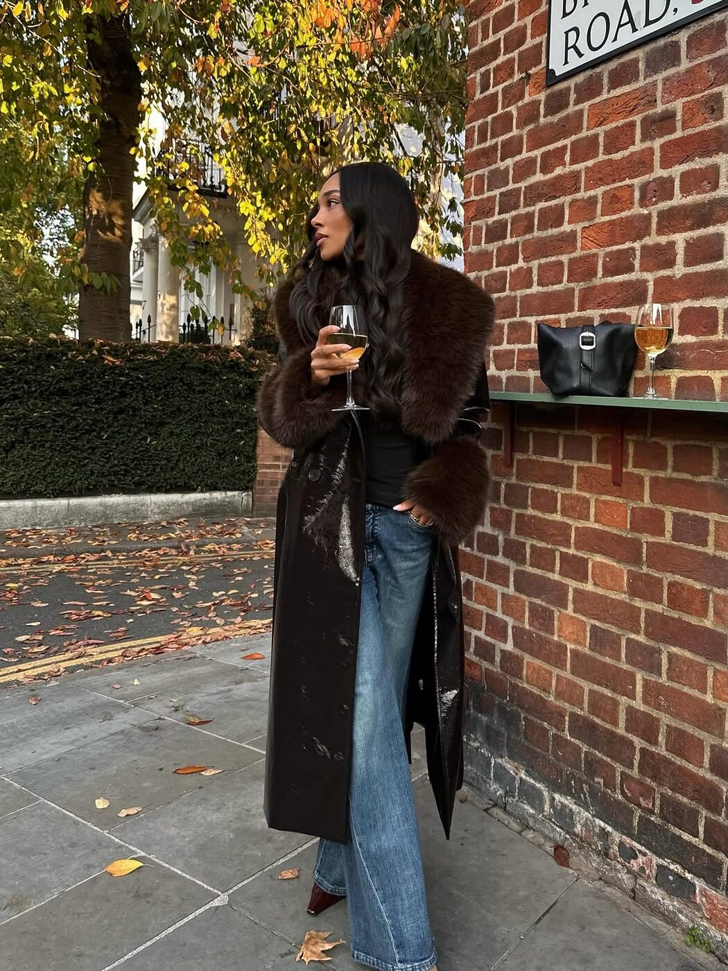 이번 시즌엔 페이턴트 레더 소재에 퍼 트리밍이 가미된 아우터를 추천합니다. 그 자체로 광택 있는 레더에 풍성한 퍼가 만나 한층 럭셔리하고 세련된 분위기를 연출합니다. 존재감이 강한 아우터인 만큼 이너는 블랙 니트 톱이나 데님으로 힘을 빼 전체적인 스타일의 밸런스를 맞춰보세요.