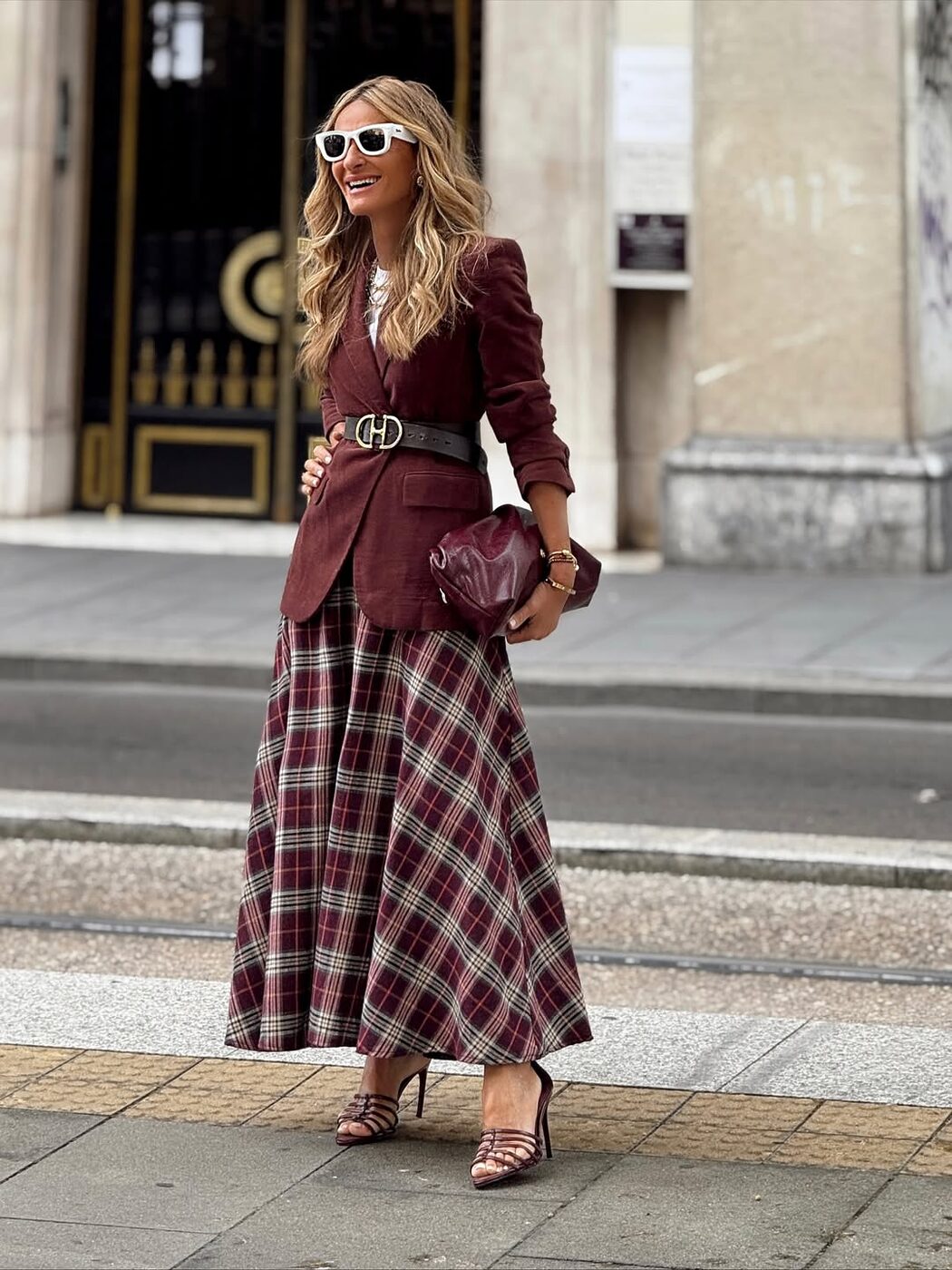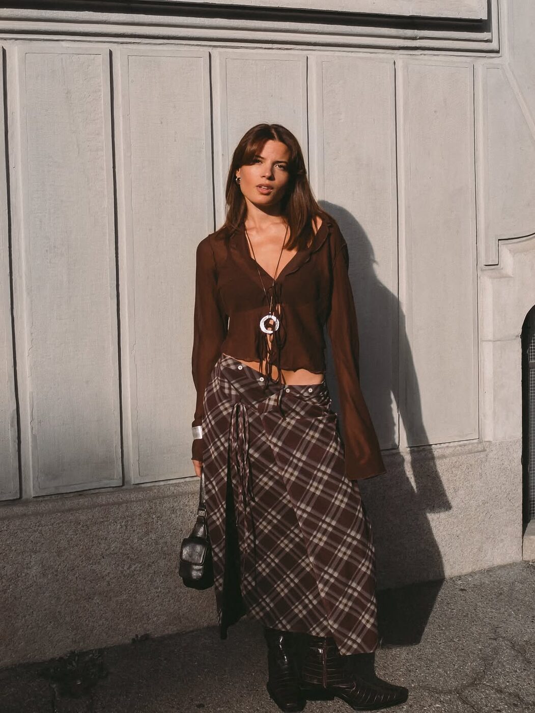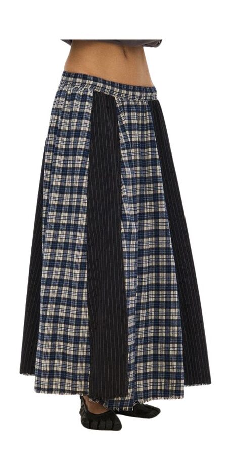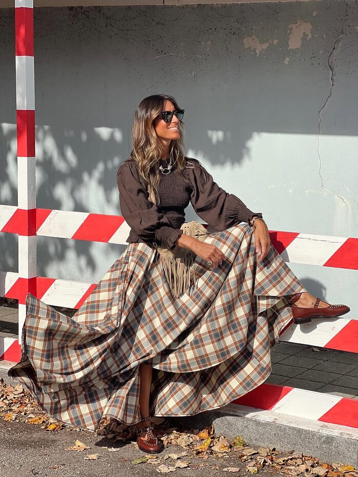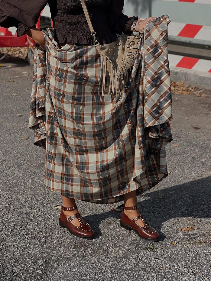 발등을 가리거나 발등을 덮을 만큼 긴 체크 스커트는 페미닌 무드를 극대화해 줍니다. 기다란 길이와 반듯한 체크 패턴이 만나 걷기만 해도 근사해 보이는 효과를 선사하거든요. 스커트 실루엣도 중요하지만 무엇보다 관건은 매치하는 아이템! 스커트와 다른 형태의 체크 패턴 상의, 웨스턴 풍 프린지 장식 백 등 색다른 조합을 마음껏 시도하세요.