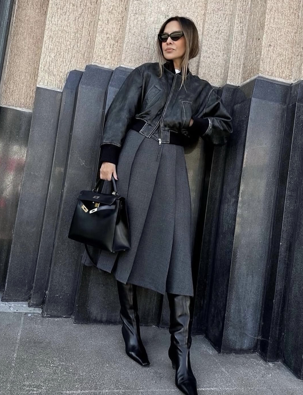 플리츠가 클수록 더 모던하고 시크한 무드를 선사해요. 진한 그레이의 칼각 주름이 시선을 사로잡는 스커트엔 블랙으로 강렬하고도 세련된 옷차림을 완성했습니다. 블랙 롱 부츠와 레더 보머 재킷, 그리고 블랙 토트 백으로 카리스마 넘치는 레이디라이크 스타일을 선보였죠.