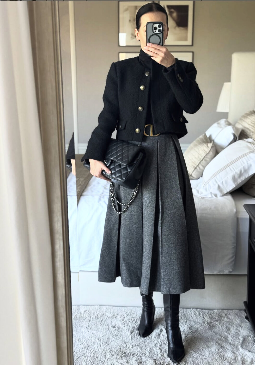 연말 모임 룩으로 적극 추천해요. 볼드한 플리츠의 미디 스커트에 블랙의 숏 재킷과 스키니 부츠를 신어 글래머러스함을 드러냈어요. 럭셔리한 포인트를 살려줄 버클 벨트로 허리로 강조하고 클래식한 체인 백을 들었습니다. 타임리스 룩의 정석은 바로 이런 것 아닐까요?