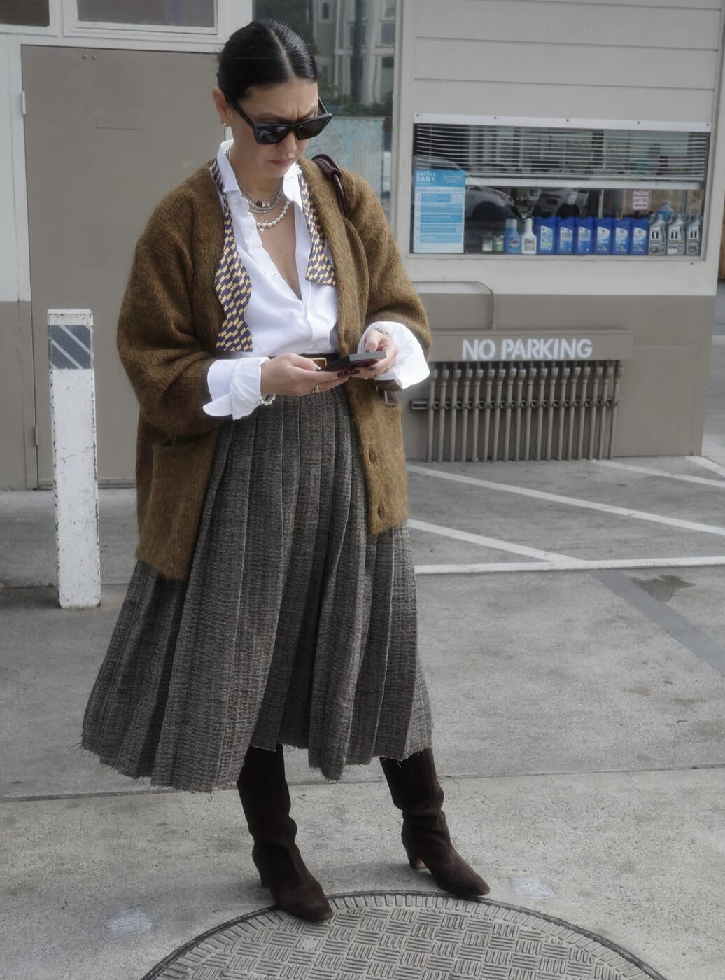 블랙에서 벗어나 좀 더 가을 분위기를 내 볼까요? 그러기엔 브라운을 빼 놓을 수 없죠. 촘촘하고 풍성한 플리츠가 들어간 미디 스커트에 화이트 셔츠와 브라운 카디건을 매치해 내추럴하고 포근한 가을 록을 완성했습니다. 여기엔 브라운 스웨이드 부츠로 완벽한 마무리를 선보였어요.