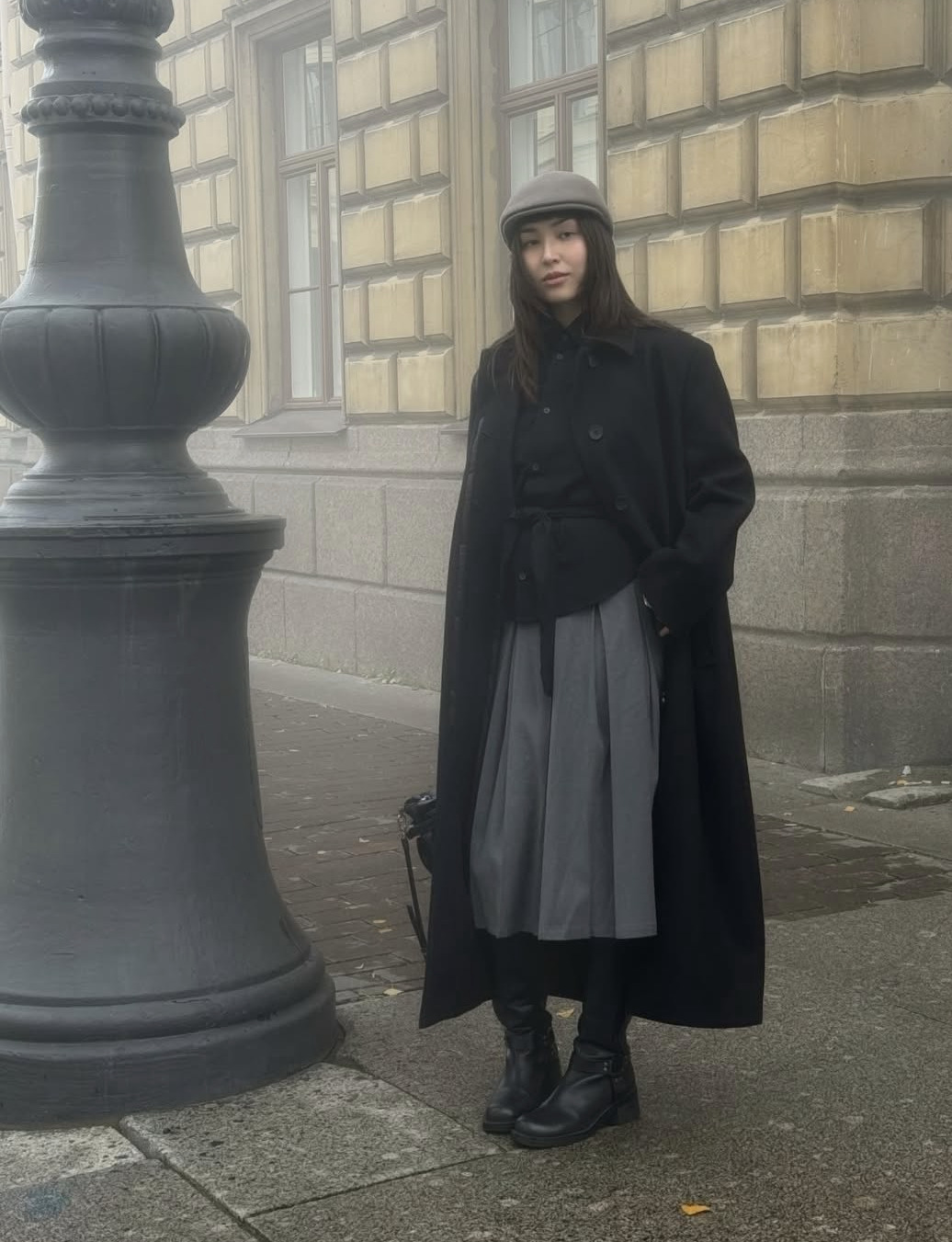 이 미디 플리츠 스커트는 어떤 신발을 신는지에 따라 그 분위기가 사뭇 달라져요. 미디 길이 스커트에 앞 코가 둥근 투박한 힐의 라이딩 부츠로 은근한 록시크 무드로 소화했요. 블랙 롱 코트와 헌팅 캡이 겨울 옷차림에 에지를 더합니다.