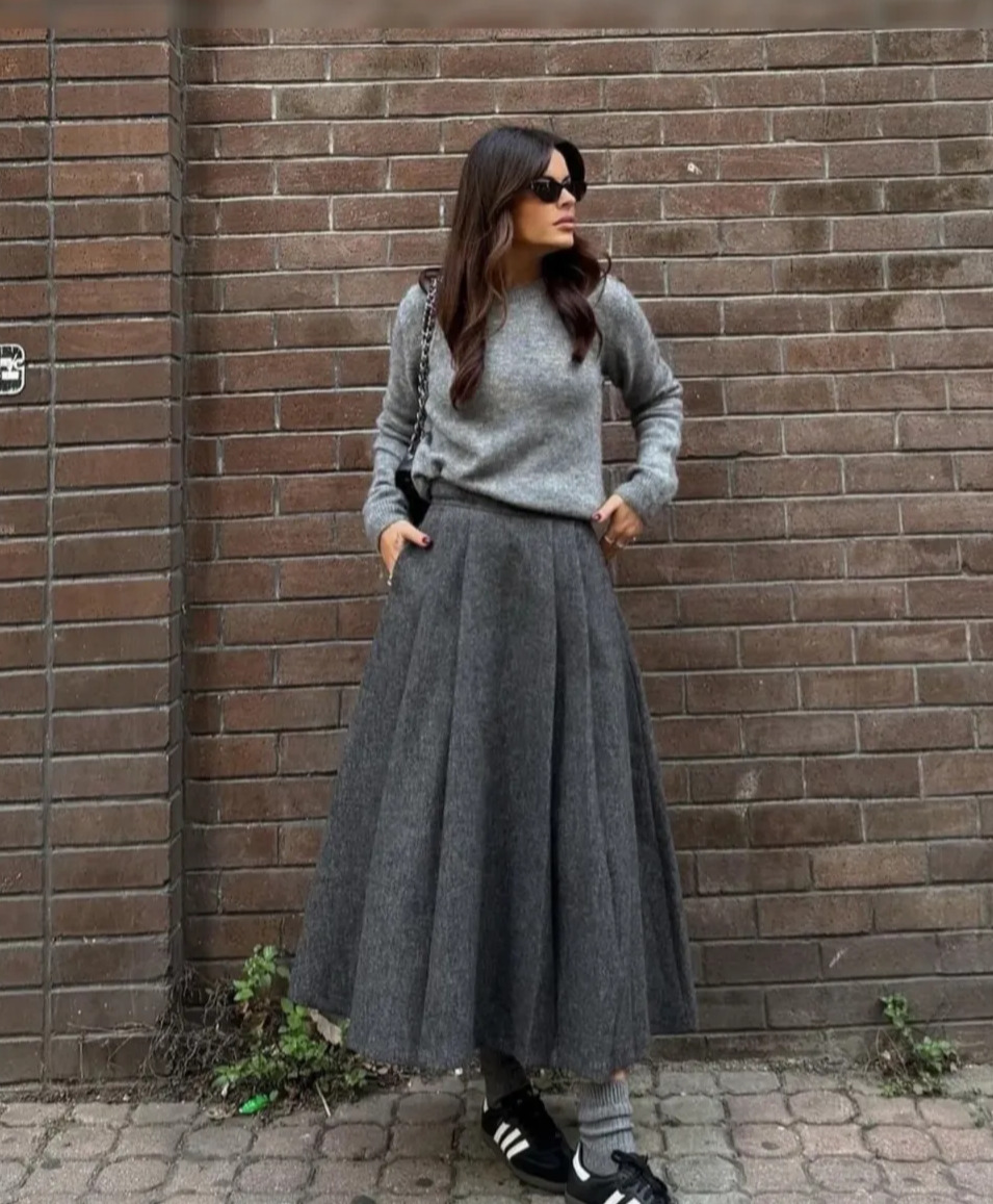 잊을만하면 등장해 세련된 옷차림을 선사하는 그레이 컬러의 플리츠 스커트, 은근히 유행타지 않는 이 스커트는 매년 이 시기에 꺼내 입어도 질리지 않습니다. 오피스 룩부터 연말 모임, 그리고 데이트 룩으로도 손색없을 이 미디 스커트의 스타일링을 눈여겨보세요.