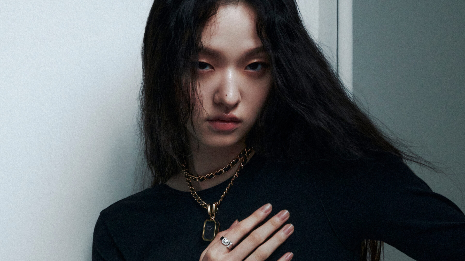 왼손 손목에 착용한 18K 옐로 골드에 블랙 래커 다이얼, 두 줄의 스틸 체인 브레이슬릿으로 이루어진 프리미에르 아이코닉 체인 더블 로우 워치, 주얼리는 모두 N°5 컬렉션, CHANEL Watches & Fine Jewelry 제품.