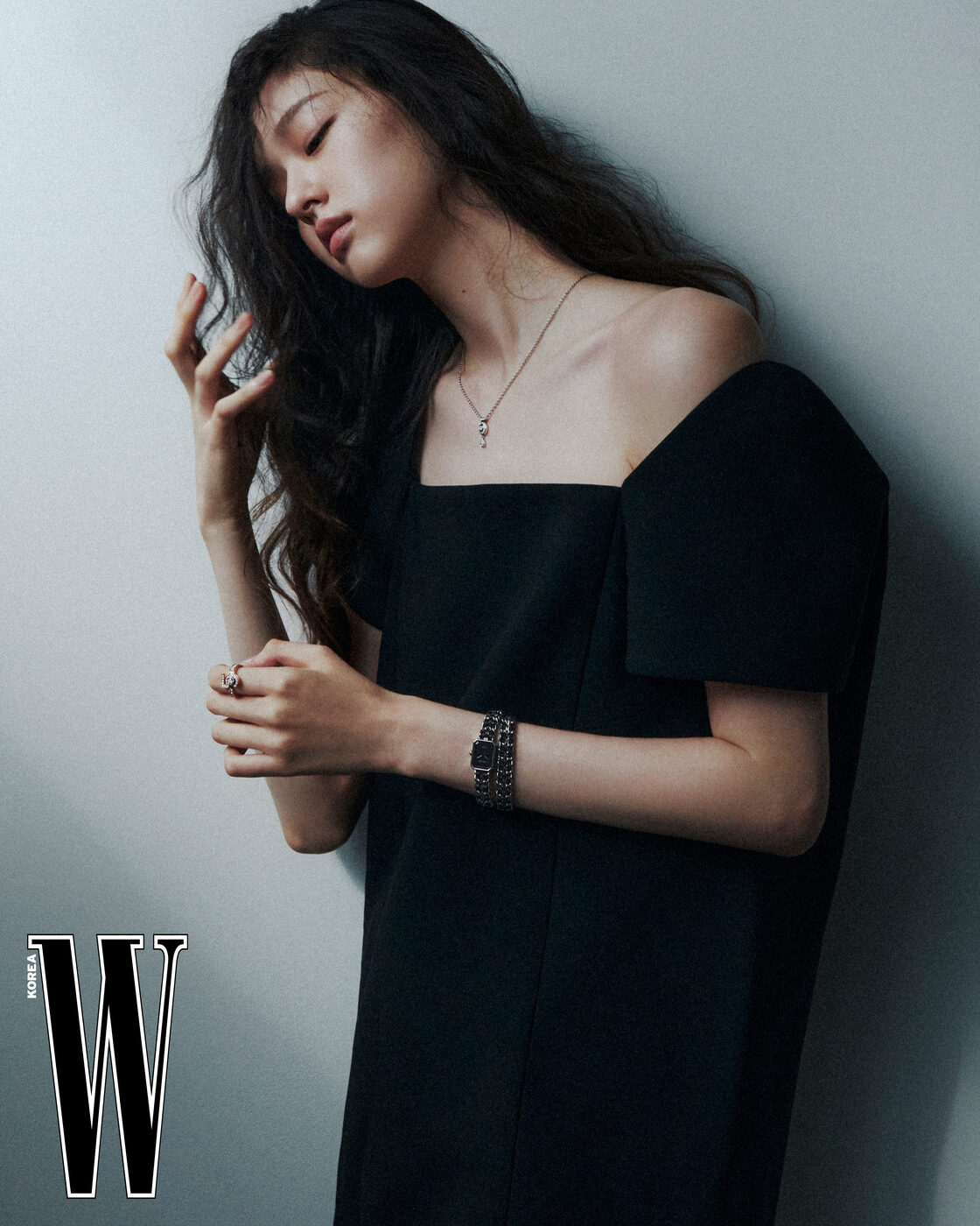 오른손 손목에 착용한 브릴리언트 컷 다이아몬드 52개가 세팅된 스틸 케이스, 벨벳 장식의 블랙 러버 스트랩으로 이루어진 프리미에르 리본 워치, 주얼리는 모두 N°5 컬렉션, CHANEL Watches & Fine Jewelry 제품.