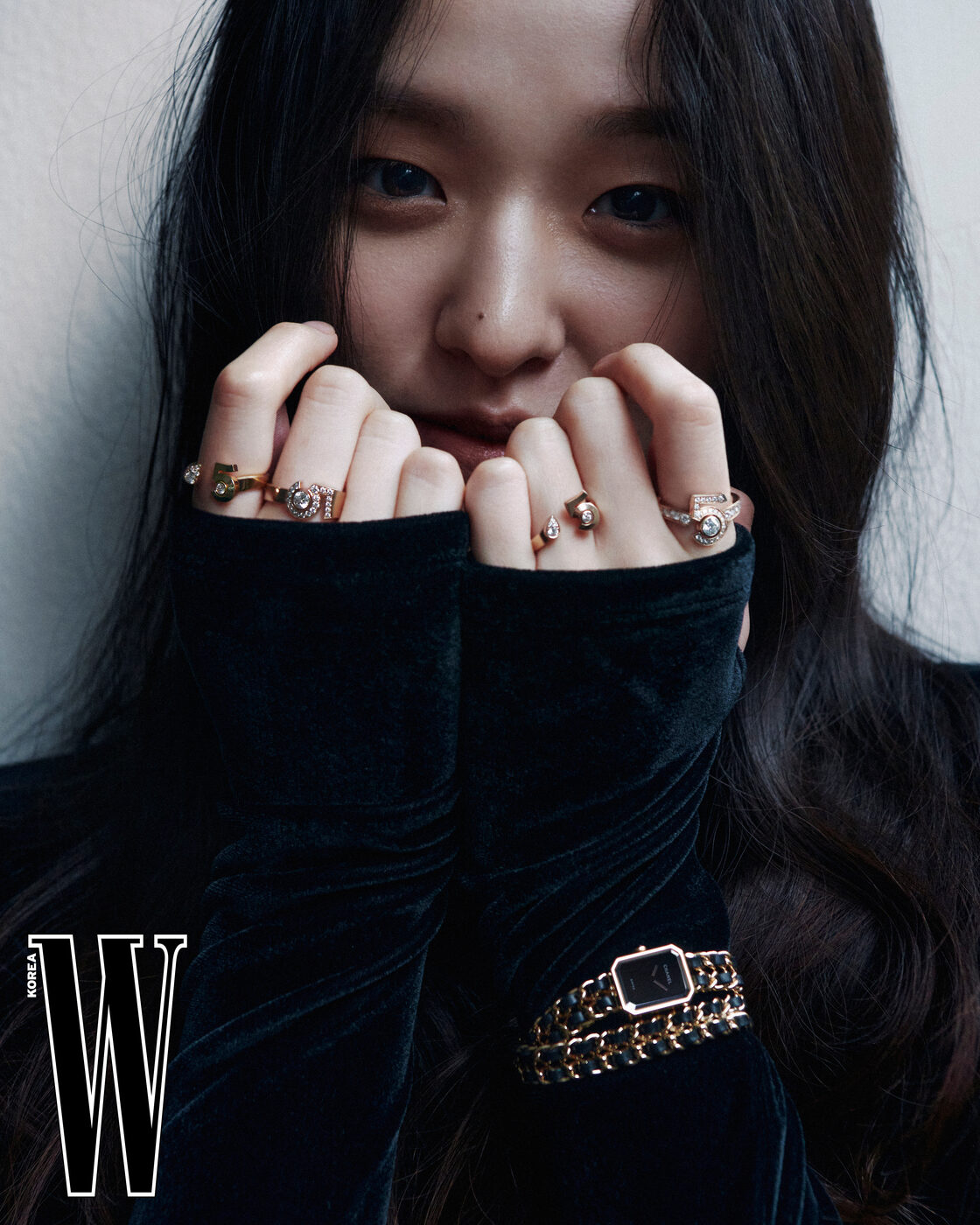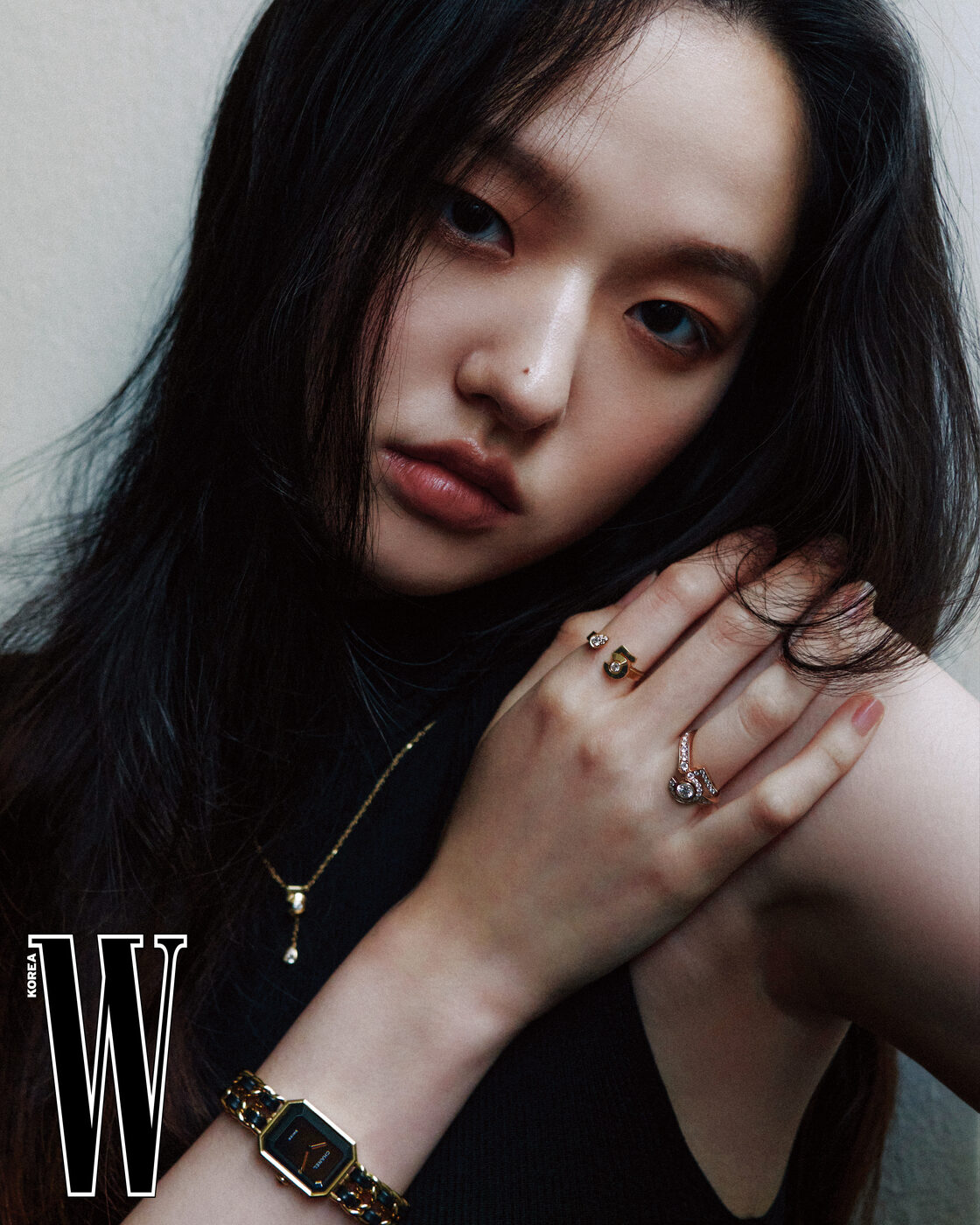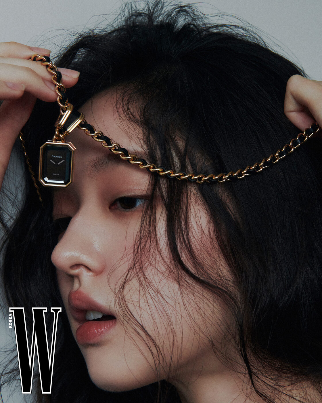 왼손 손목에 착용한 벨벳 장식의 블랙 러버 스트랩으로 이루어진 프리미에르 리본 워치, 오른손 손목에 착용한 18K 옐로 골드 코팅 케이스와 18K 옐로 골드 코팅 체인, 블랙 레더 브레이슬릿으로 이루어진 프리미에르 오리지널 에디션 워치, 주얼리는 모두 N°5 컬렉션, CHANEL Watches & Fine Jewelry 제품.