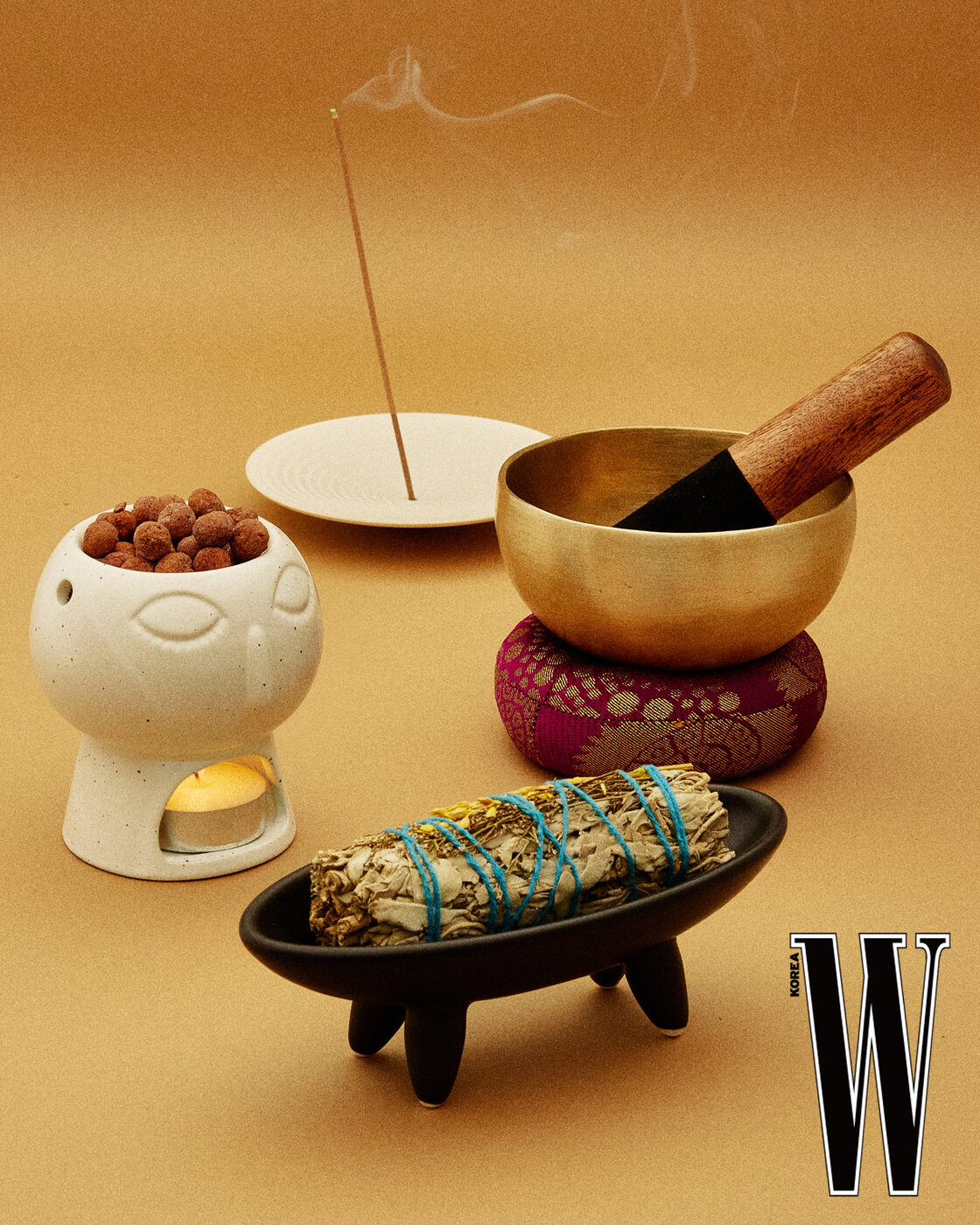 화이트 세이지 향의 스머지 스틱과 스머징의 후각적, 시각적 경험을 돕는 홀더 세트. 홀더는 재가 날리지 않도록 오목한 형태를 띠며, 장식용 오브제로도 손색없다.
