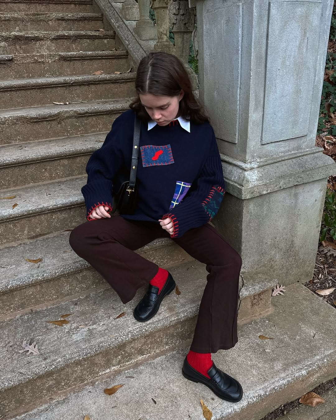 좀 더 어린 아이 같은 무드를 내고 싶다면 인플루언서 리즈 블럿스타인의 룩을 눈 여겨 보세요. 셔츠 위에 패치워크 디테일이 더해진 오버핏 스웨터를 매치하고, 브라운 부츠컷 팬츠와 클래식한 로퍼로 마무리해 세련된 분위기를 완성했죠. 여기에 빨간 양말을 더해 위트 있는 포인트를 살린 센스까지! 유쾌한 겨울 데일리 룩을 연출했어요.