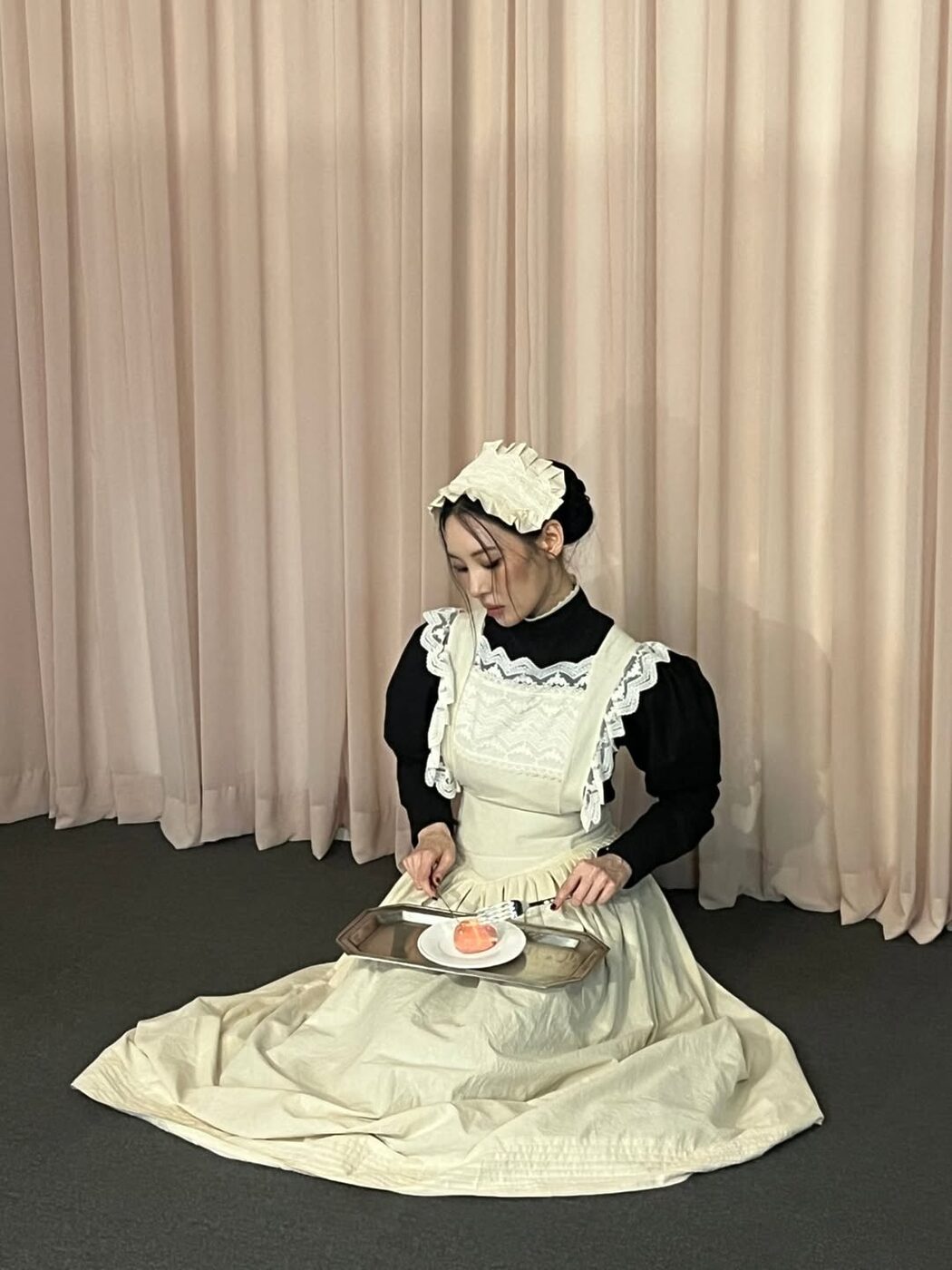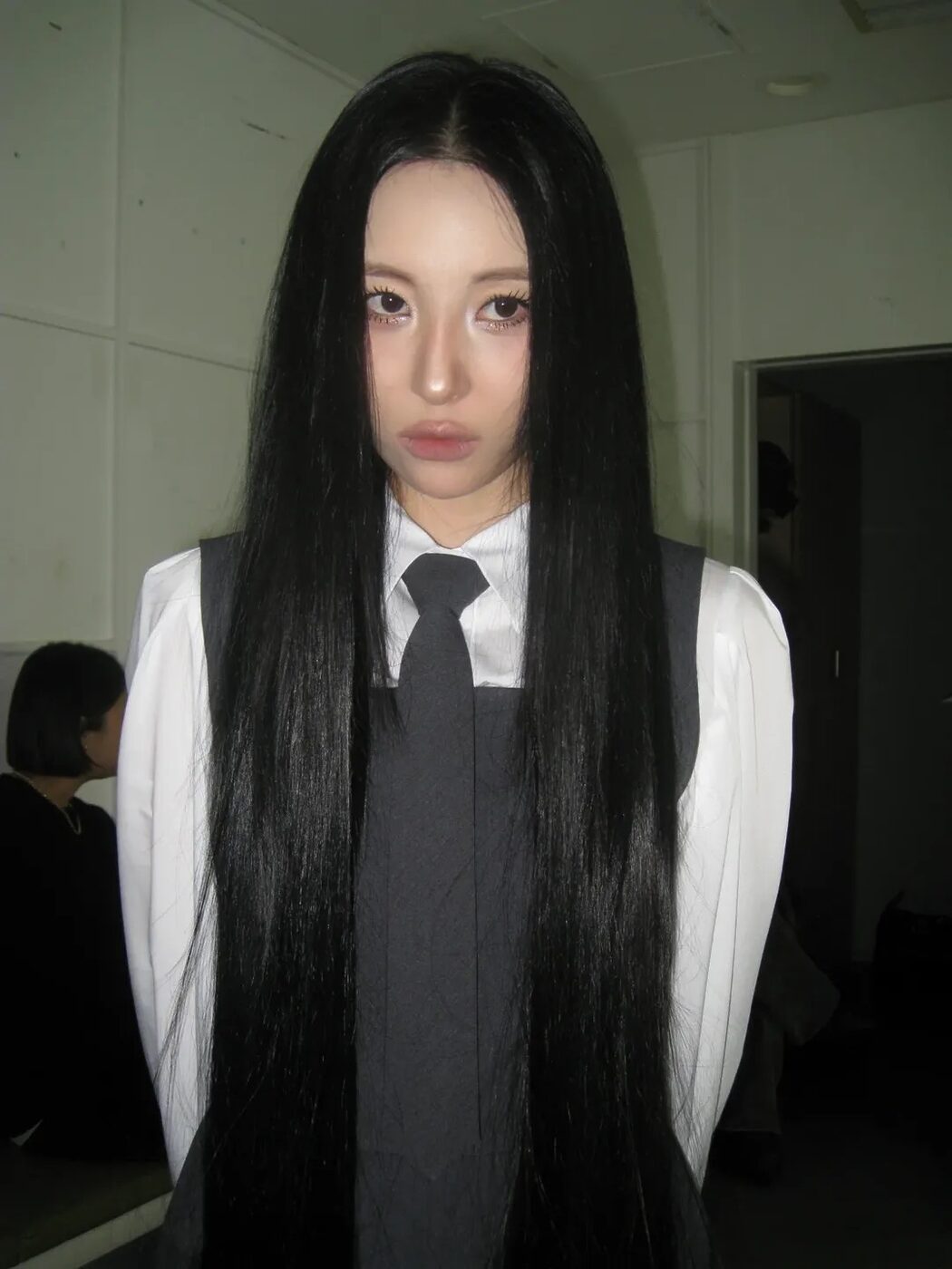 흰 셔츠에 회색 베스트와 타이를 단정히 맨 스쿨 룩과 프릴 원피스에 하얀 스타킹과 동물 머리띠를 더한 소녀인 모습의 반전미도 있었는데요. 웬즈데이가 절로 떠오르는 으스스하면서도 사랑할 수 밖에 없는 다크 러블리가 담긴 선미만의 독보적인 콘셉트였습니다.