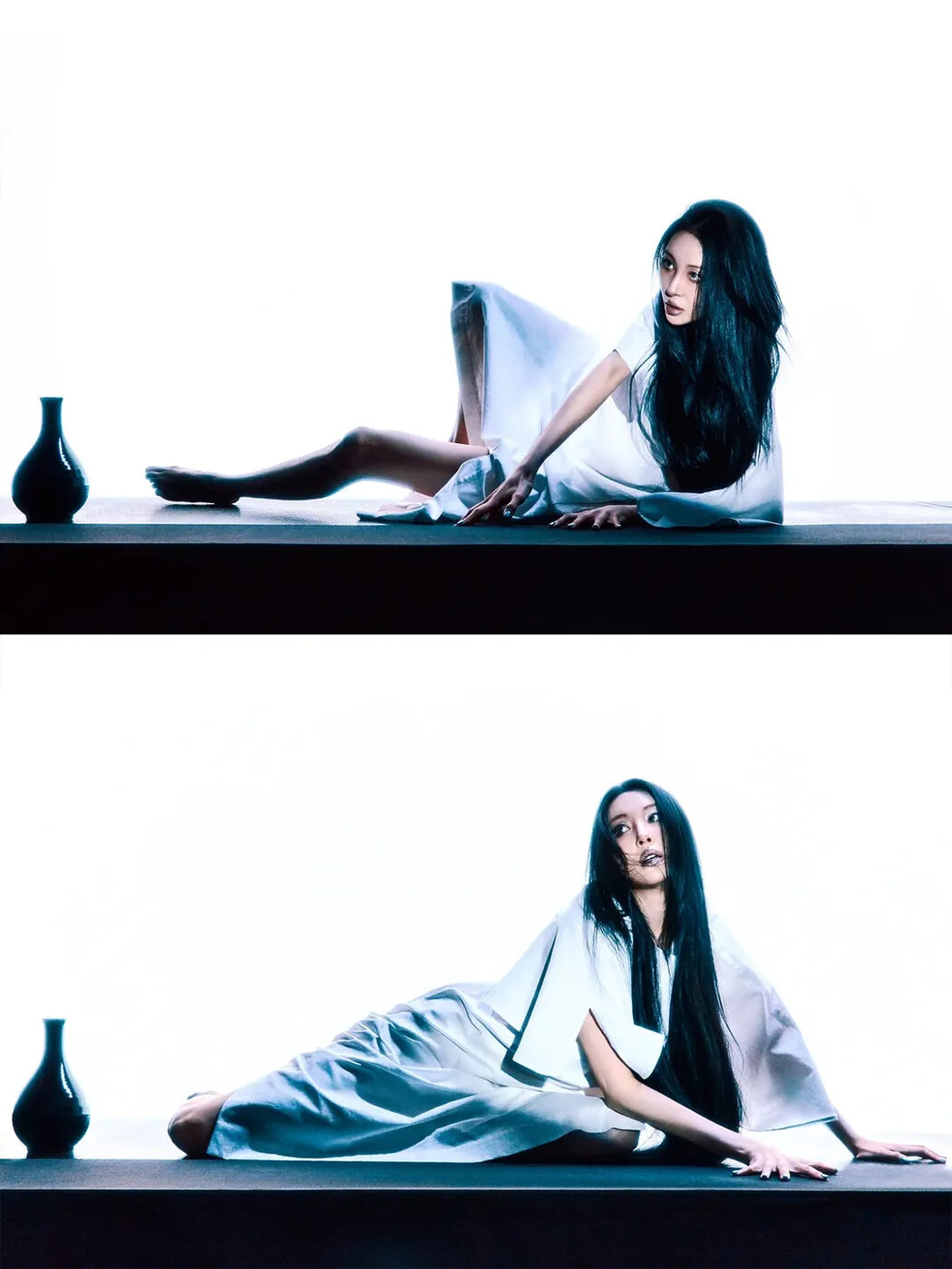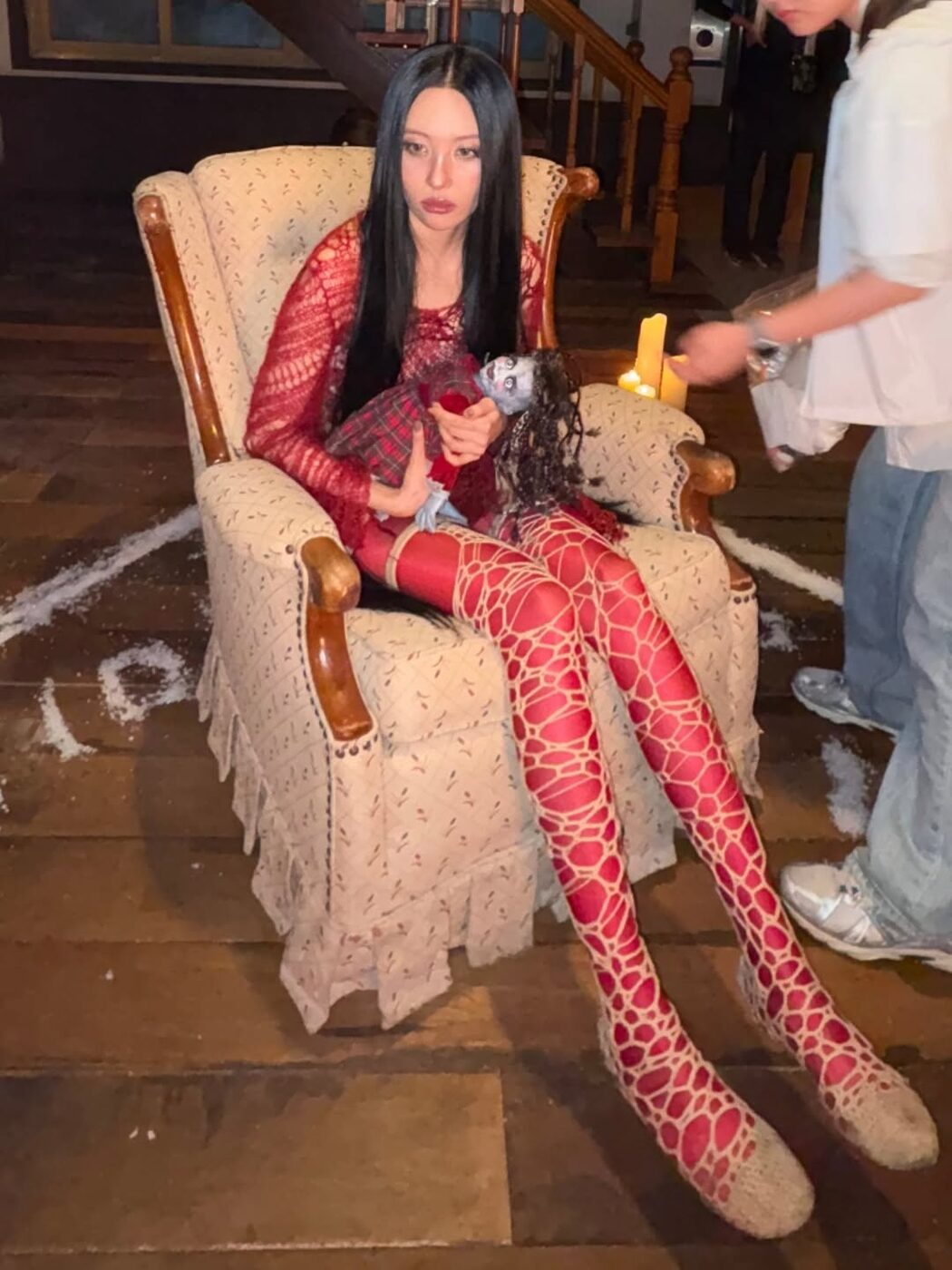 소녀 감성이 묻어나는 프릴 앞치마와 헤어밴드로 얌전한 메이드의 모습 속 숨겨진 반전으로 돌아온 선미. 다크하고 고스한 감성을 키치하게 풀어냈습니다. 허리까지 오는 검은 긴 생머리에 새하얀 롱 원피스만 걸쳐 처녀 귀신을 연상케하는 룩은 물론 붉은 피를 연출한 듯한 빨간 네트 톱과 레깅스에 스킨 톤의 망사 스타킹을 레이어드한 관능적인 패션을 선보였죠.
