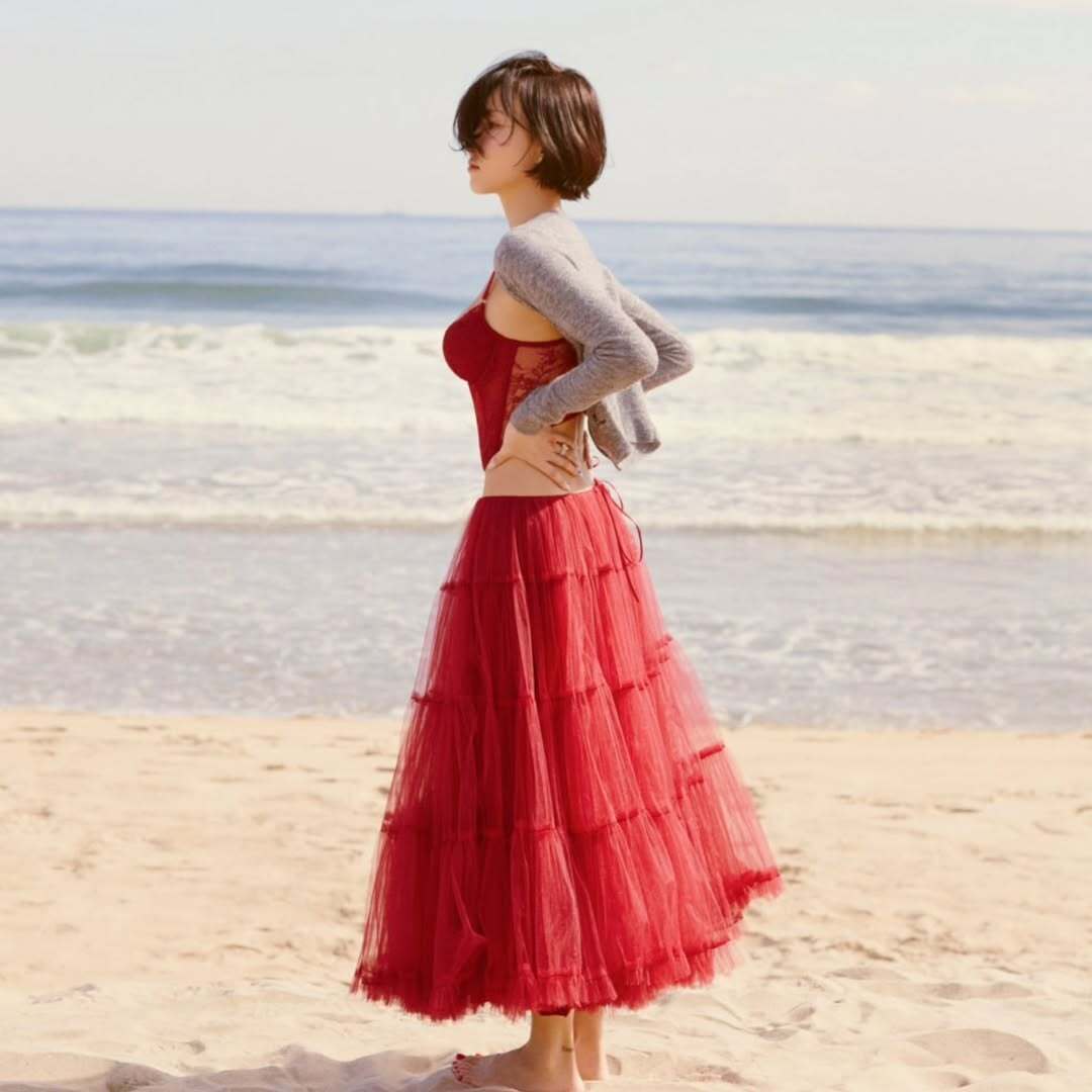 이제까지 본 강렬한 콘셉트들과 다르게 여유롭고 은은한 감성으로 정반대의 노선을 선택한 화사. 붉은 보디콘 톱과 툴 스커트에 그레이 볼레로를 걸쳐 잔잔한 배경 속 매혹적인 분위기로 물들였습니다.