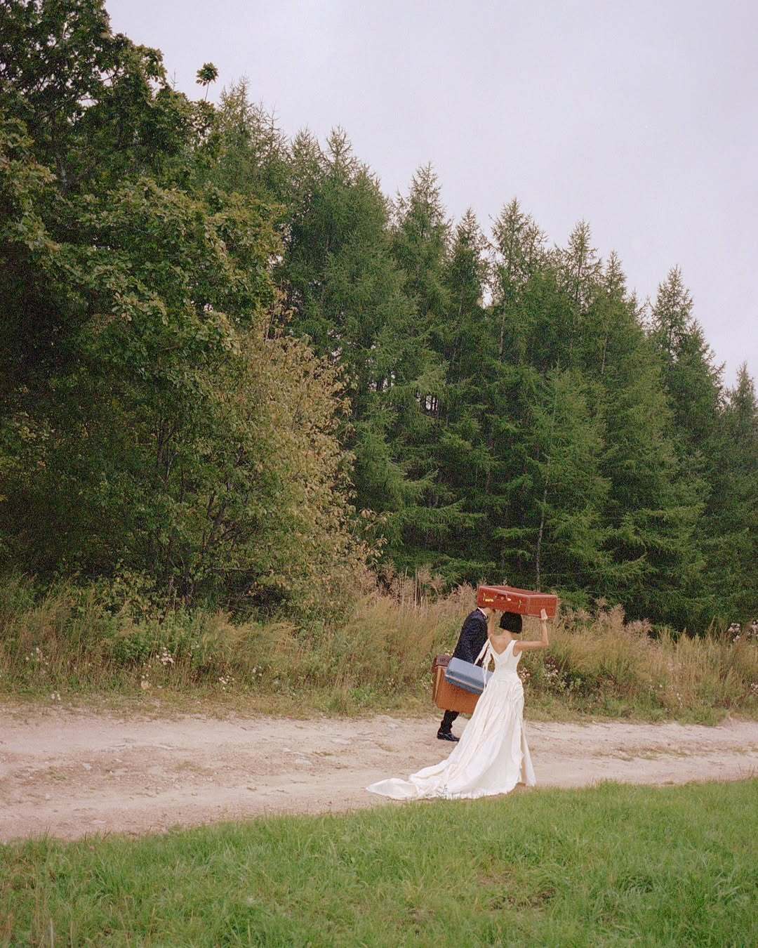 반면 새하얀 웨딩드레스는 한쪽 어깨가 흘러내려 타이를 묶은 어깨 라인과 프릴이 흩날리는 미완성인 듯한 형태였는데요. 로맨틱하면서도 빈티지한 이 드레스의 정체는 이탈리아 브랜드 마리나 이어리의 드레스입니다. 그녀 덕분에 결혼을 앞둔 예비 신부들에겐 흥미로운 레퍼런스가 되었죠. 오래된 자동차와 네모난 여행 가방, 꽃무늬 천 소파 등의 소품들과 클래식한 무드의 의상과의 조화로움으로 마치 한편의 짧은 영화 같은 뮤비의 모습이었습니다.