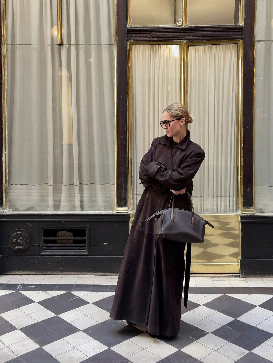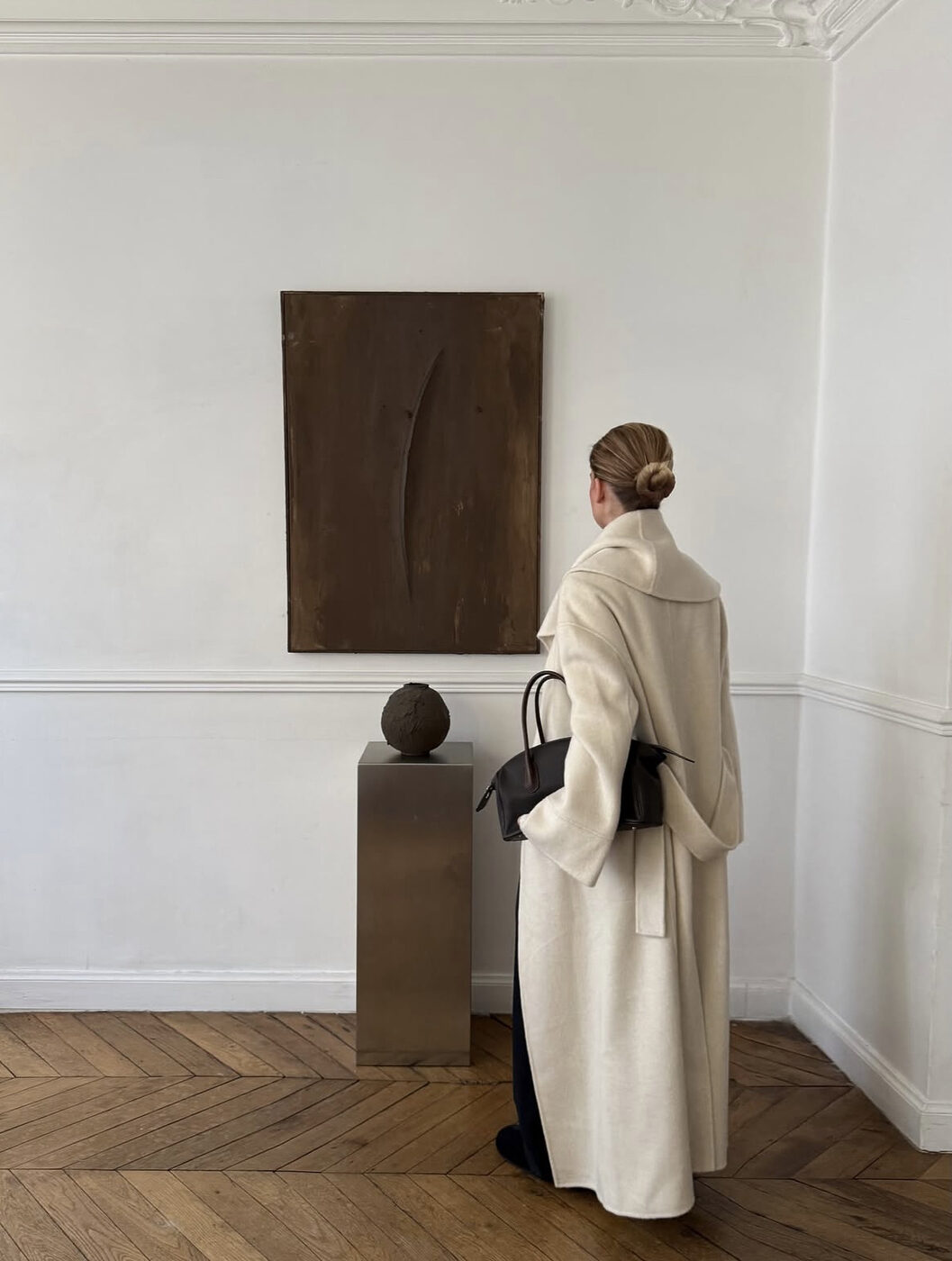 롱 코트의 낭만이란 이런 것이 아닐까요? 앉을 때나 걸을 때 펄럭이는 형태요. 이 기장감이 만들어내는 여유이자 장점입니다. 그리고 허리선을 잡아줄 수 있는 벨트나 너무 루즈해지 않게 도와줄 어깨 견장이나 라인이 있다면 금상첨화겠죠.
